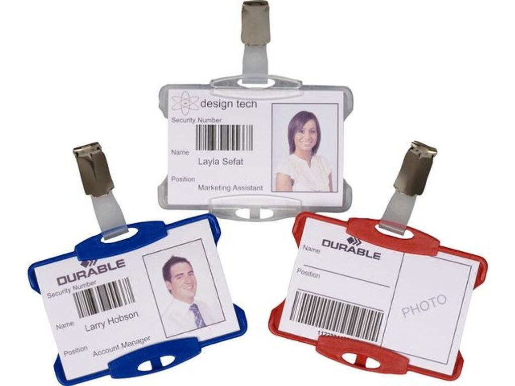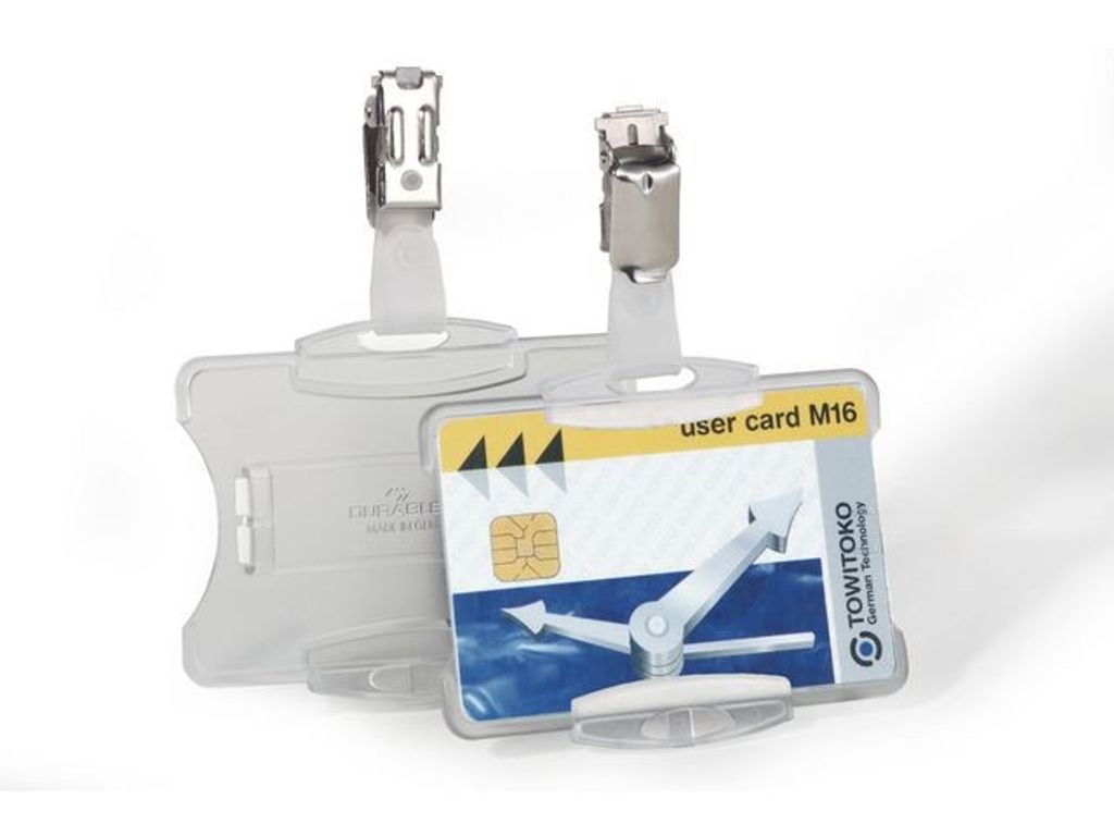 Sätt in id-kort eller passerkort i korthållarna från Durable för snabb och praktisk legitimation. Dela ut de här Durable-korthållarna som ett snabbt sätt att identifiera anställda eller besökare på arbetsplatsen. Genomskinlig polystyren visar namnet klart och tydligt. Klämman fästs enkelt på fickor eller kavajslag. De här Durable-korthållarna levereras i 25-pack för att räcka till kontorets personal eller konferensgrupper. - Korthållare med klämma - Perfekt för besökare eller anställda - Tålig polystyren med öppning - Färg: Transparent - Mått: 54 x 85 mm - 25-pack