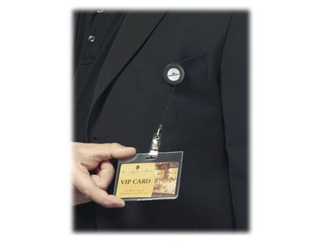 Beskrivning av Korthållare DURABLE jojo 10/fp Praktisk jojo med knäppfäste för t.ex namnskyltar och passerkortshållare. Utdragbar upp till 80cm. Hållaren är av plast med metallclips på baksidan för enkel fastsättning. Tillverkad av PVC.