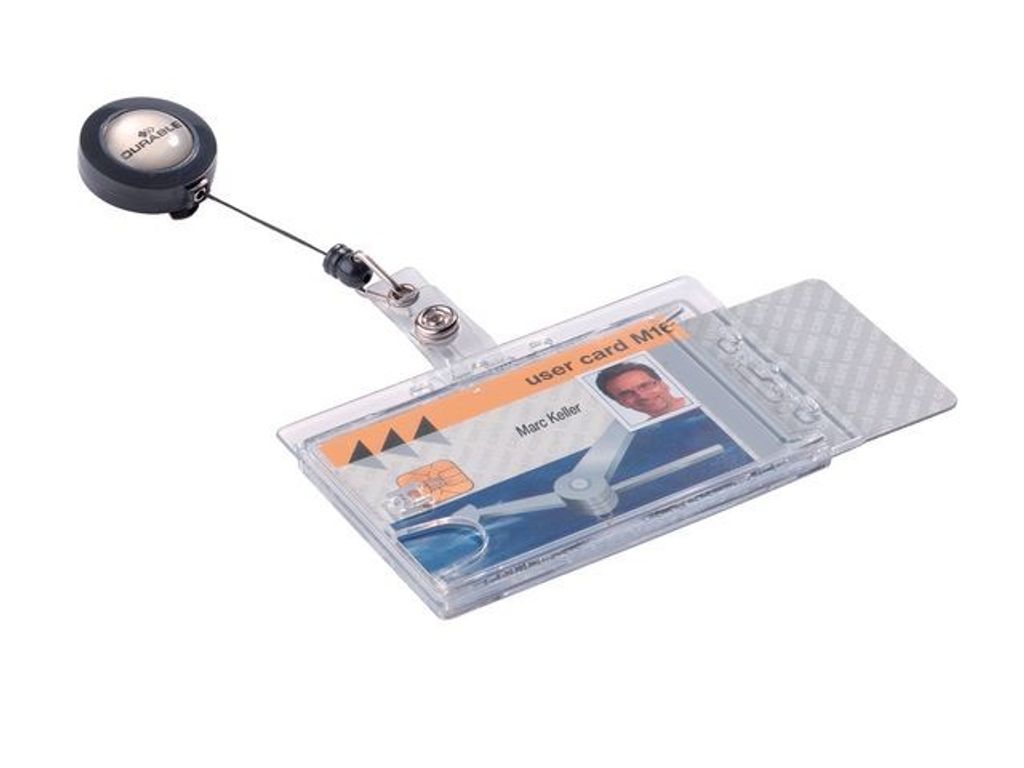Denna DURABLE dubbelsidiga passerkortshållare passar utmärkt för ID-kort, magnetkort, passerkort och nyckelkort. Denna starka dubbelsidiga passerkortshållare i akryl har plats för en kombination av ID-kort och passerkort. Passerkortshållaren DURABLE kan användas i liggande eller stående format utan att skada magnetremsan. Med korthållarnas inbyggda tumgrepp tar du enkelt ut korten, vilket innebär att passerkortshållaren kan användas i olika situationer. Dessutom har den här transparenta korthållaren en jojo så att passerkortshållaren kan fästas på alla klädesplagg. Tillverkad av PVC. - Den starka akrylhållaren ger optimal säkerhet för två kort eller korthållare - Med korthållarnas inbyggda tumgrepp tar du enkelt ut korten - Levereras med en jojo så att kortet kan fästas på kläder - Sladdlängd: 80 cm - Insticksetikett: 54 x 90 mm - Färg: transparent