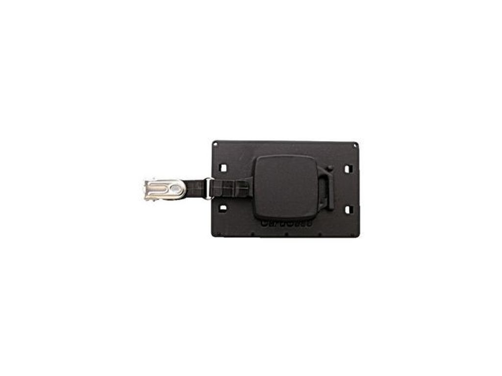 Korthållare med inbyggd jojo och bältesklämma. Stående korthållare för ett kort med inbyggd jojo för högerhänta. Tumgrepp där med hjälp av tummen kortet förs ut. Efter användande åker kortet in automatiskt i hållaren. Levereras med monterad yoyo och bältesklämma. Svart. Mått 85x54mm. 80cm långt snöre.