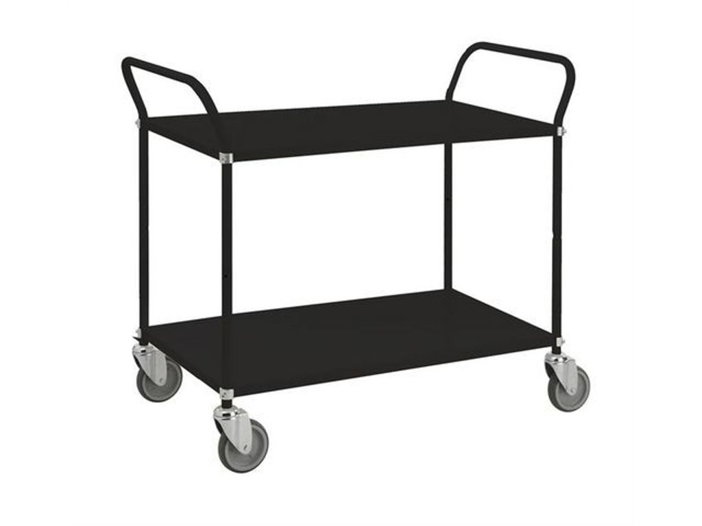 Praktisk svart plåtvagn i två plan. Hyllplanen kan monteras med kant upp eller ner efter eget önskemål. Rejäla 125mm hjul vilket gör den lätt att köra. Levereras omonterad. - Belastning: 250kg - Storlek:1080x480x940mm - Höjd till översta hyllplan: 760mm - Avstånd mellan hyllplan: 530mm - Hyllplan: 900x440mm - Hjul: 4 länkhjul, 125mm - Vagnens vikt: 23kg - Bromsade hjul: Nej