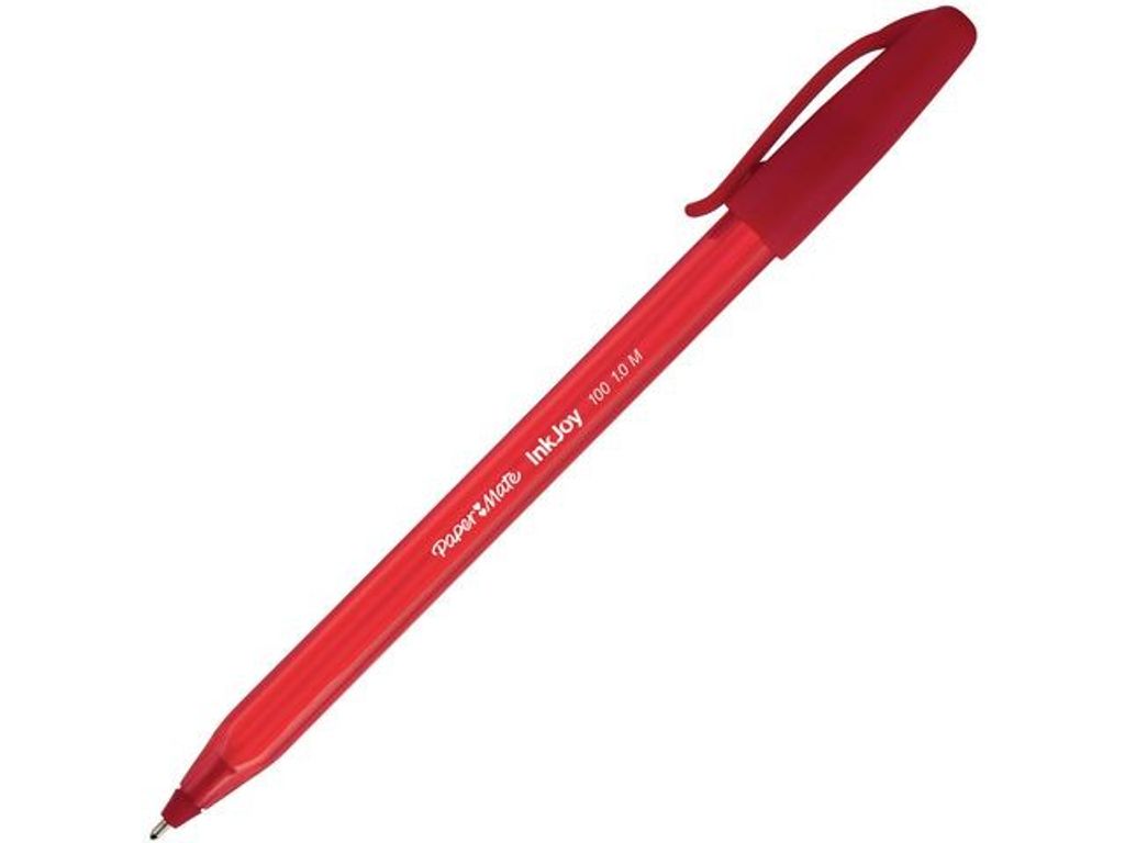 Paper Mate® InkJoy™ 100-kulspetspennans triangulära design gör den bekväm och kontrollerad att skriva med. Denna korkförsedda kulspetspenna har en design som framhäver både form och funktion. Medan den transparenta pennkroppen och den vita påfyllningen ger pennan ett slimmat, modernt och fräscht utseende ger dess triangulära form dig komfort och kontroll när du skriver. Den stora spetsen på 1,0 mm tillsammans med det revolutionerande InkJoy™-skrivsystemet ger mjuka linjer för klar och tydlig skrift. Du kan också ha denna Paper Mate®-penna nära till hands genom att fästa den praktiska fickklämman på mappar, anteckningsböcker, fickor och mycket mer. - Huv - Spetsbredd: 1,0 mm - Färg: Röd - Färg pennkropp: Röd