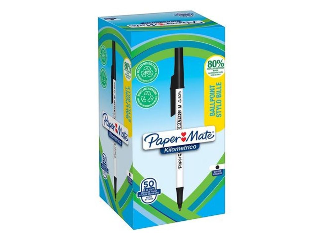 Paper Mate Kilometrico-kulspetspennor är tillverkade av 80 % återvunnen plast. Varje förpackning med 50st kulspetspennor står redo att göra ditt skrivande minnesvärt från första strecket till det sista ordet. Pålitlig skrift som du kan lita på, nu tillverkade av 80 % återvunnen plast och sålda i en plastfri återvinningsbar förpackning. Spetsbredden på 1mm fördelar bläcket perfekt och ger en pålitlig, jämn skrivupplevelse. Med skarpa bläckfärger och matchande detaljer för enkel färgidentifiering blir Kilometrico-pennorna ditt signaturverktyg för kreativitet och organisation. Den rundade pennkroppen ger ett bekvämt och naturligt grepp och det klara bläcket utmärker sig på sidan och skapar ett kraftfullt, proffsigt intryck. Finns även med blått eller rött bläck med en 1,0 mm mediumspets. - Perfekta för att skriva på alla typer av papper - skriver längre än en kilometer! - Spetsbredd: 1mm - Bläck: svart - 50st per förpackning - Förpackningen inkluderar: 50st svarta kulspetspennor