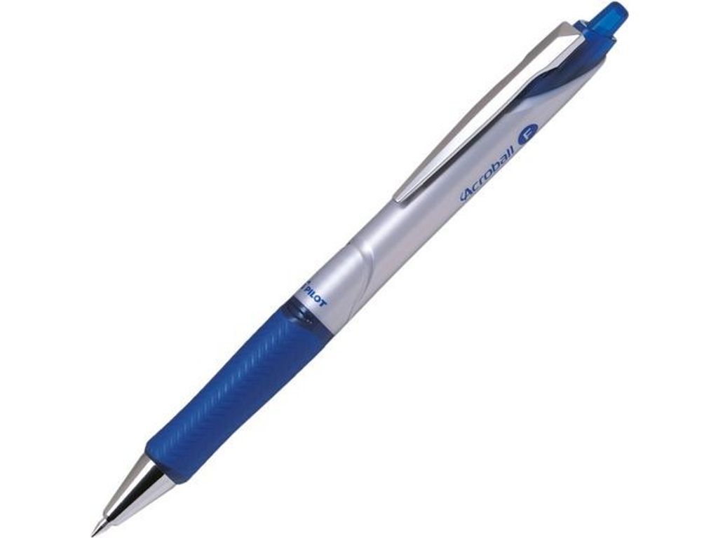 Pilot Acroball kulspetspenna har ergonomiskt grepp och ett slitstarkt stift i hårdmetall. Den här Pilot Acroball-kulspetspennan är både indragbar och påfyllningsbar, och det ergonomiska greppet gör den bekväm och smidig att skriva med. Med det snabbtorkande oljebaserade bläcket slipper du risken för kladd. Pennan har en tunn spets på 0,7 mm, vilket gör den utmärkt för uppgifter som kräver precision och noggrannhet. Dess hållbara kula i hårdmetall behåller formen länge och har skåror för extra stöd och stadig vridning. - Tunn spets: 0,7 mm - Indragbar spets - Ergonomiskt gummigrepp - Slitstarkt stift i hårdmetall - Snabbtorkande bläck för mindre kladd - Bläckbehållare - Påfyllningsbar - Färg på pennkroppen: Silver och blå - Bläckfärg: Blå