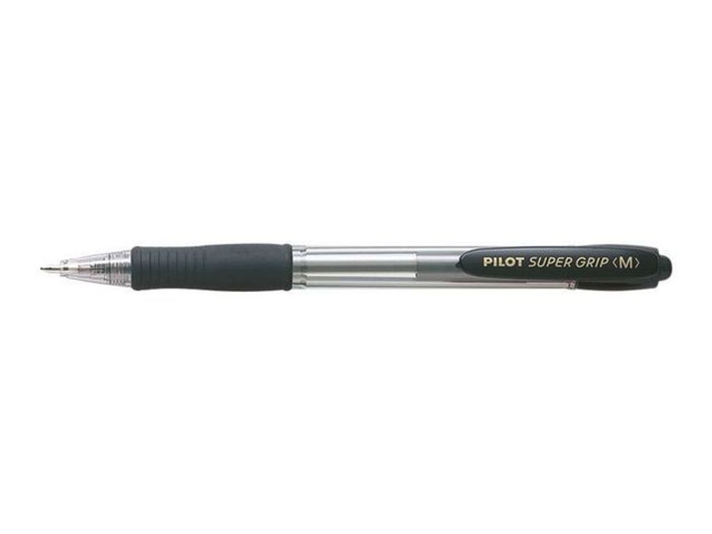Pilots kulspetspenna med klickmekanism Pilot Super Grip har ett glidfritt gummigrepp och en transparent pennkropp som visar pennans bläcknivå. Det mjuka ergonomiska gummigreppet på kulspetspennan Super Grip ger dig en bekväm glidfri skrivkänsla. Den är utformad med en ovanligt stark kulspets i tungmetall för hög prestanda och en transparent pennkropp som visar bläcknivåerna så att du inte får slut på bläck helt plötsligt. Ur den konformade medellånga spetsen rinner Pilots avancerade snabbtorkande bläckformel som är oljebaserad och gör din skrivkänsla flytande och lätt. Det är dessutom vatten- och ljusbeständigt och alltså det perfekta valet för daglig regelbunden användning. Denna flerfunktionella, mångsidiga kulspetspenna fyller du enkelt på med Pilots påfyllningspatroner. - Klickmekanism - Spetsbredd: 1,0 mm - Linjebredd: 0,27 mm - Kan fyllas på med refill-patroner - Skrivfärg: Svart - Färg pennkropp: Transparent svart - Dokumentäkta bläck enligt ISO 12757
