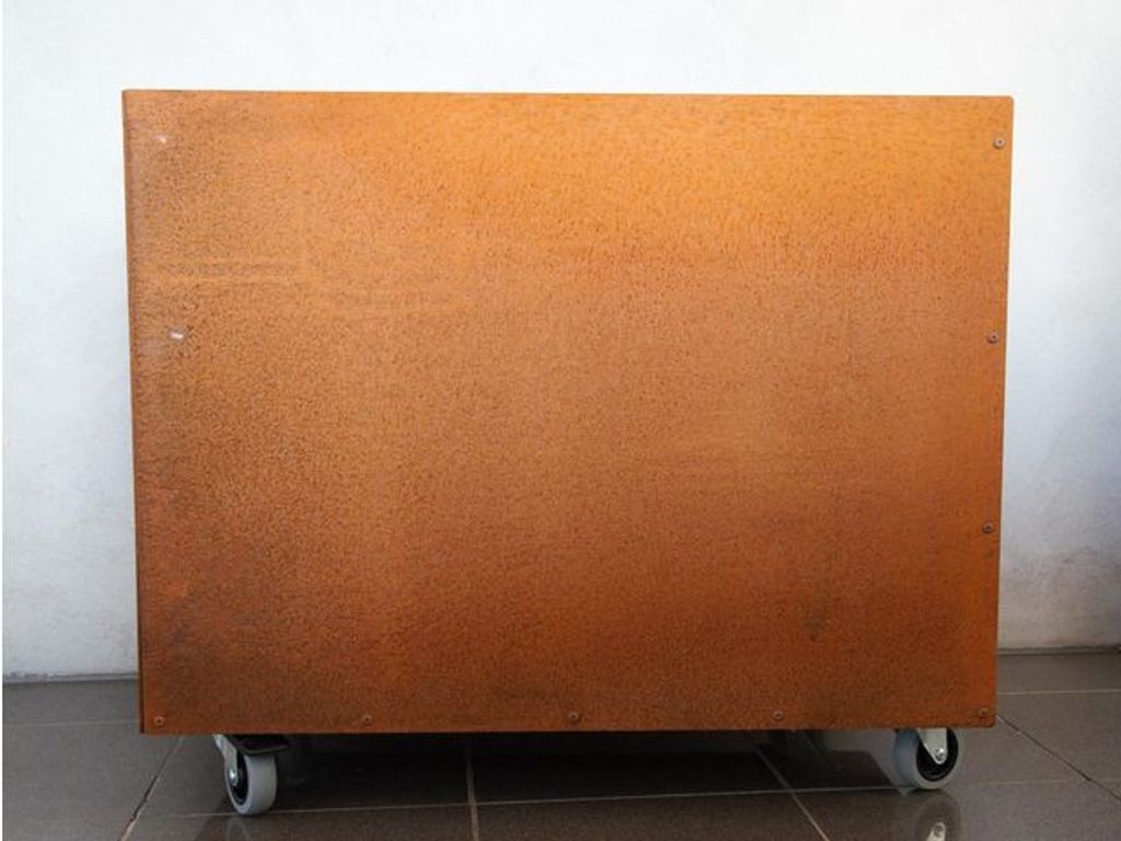 KEBAflexi-garden L-Kruka med botten är en dekorativ kruka i 2mm Cortenstål som gör krukan väldigt hållbar och rostar till en vacker gyllenbrun färg. Krukans material, Cortenstål, är ett hållbart material, som efter cirka två år avstannar i sin rostning och bildar ett skyddande lager. Krukan får därmed en väldigt god hållbarhet. Dräneringshålen förhindrar att växterna blir stående i vatten. Hjul finns som tillbehör. - Mått: 45x75x55cm - Material: Cortenstål