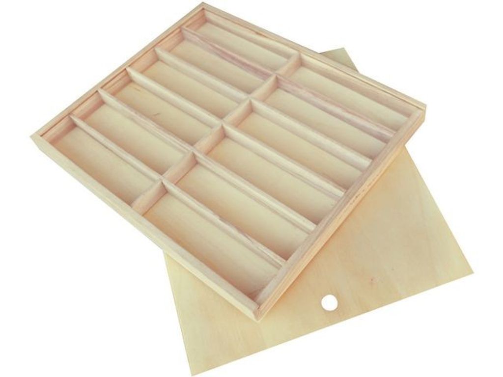 Trälåda med tolv fack och skjutlock. Mycket praktisk eftersom den underlättar att hålla ordning på pennor eller andra småsaker - Längd: 385 mm - Bredd: 285 mm - Höjd: 40 mm - Material: Trä
