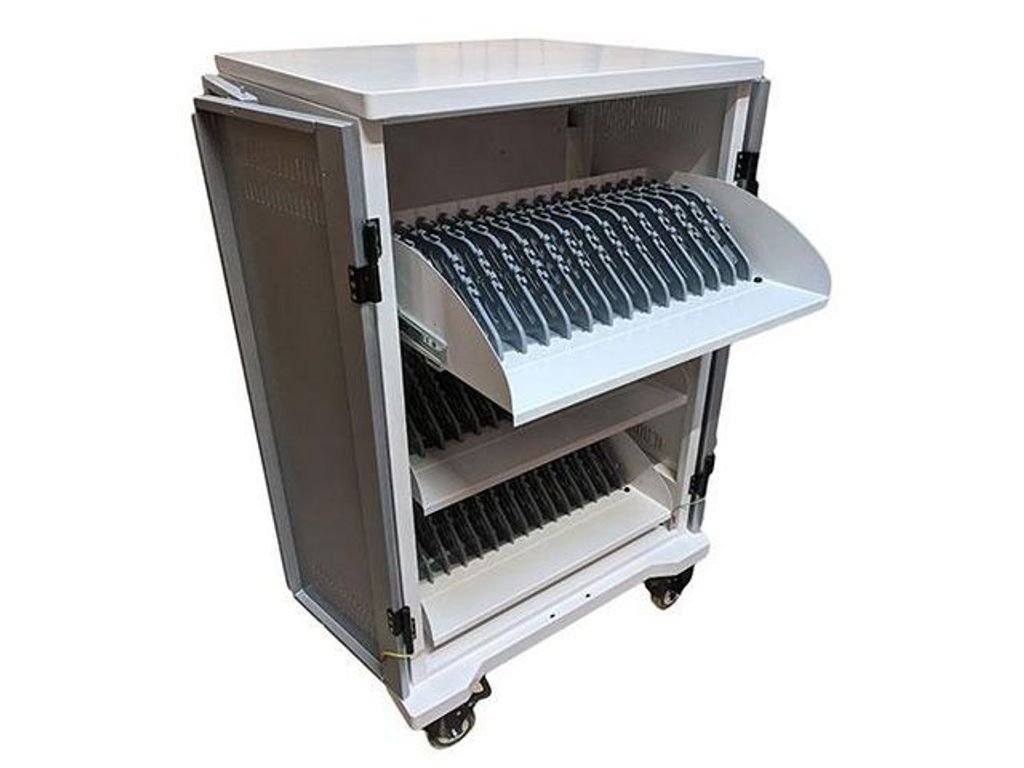 En välventilerad, robust laddvagn som håller era plattor, ChromeBook och laptops i säkert förvar. Blanda och ladda dina olika enheter i samma vagn. Har utdragbara hyllor som gör det lätt att hämta och sätta in enheterna. Går att låsa och har timer med överspänningsskydd för säker laddning. Laddas via enhetens strömadapter och klarar upp till 16' enheter. 3 års garanti. - Stålskal i pulverlackerad färg / vit huvudram och silverdörrar. - Utformad för enheter mellan 7-16'. - 4 x roterande 5' hjul med var sin lås - Utvändigt handtag för enkel förflyttning av vagnen. - Inbyggd sekventiell timer (modeller endast laddning): Med inbyggt effektbrytare. - Enkel dörr fram och bak med lås. Nyckelhål - 3 x Inre utdragbara 50% hyllor för enklare åtkomst till enheten. Tillverkad av stål. - Enheternas laddkablar klickas fast i avdelarna som sitter mellan enheterna i skåpet. Facken är 40 mm breda. - Kommer färdigmonterad. Varje enhet levereras på separat pall. - CE -godkänd - ISO 9001: 2015 certifierad. - BxDxH: 710 x 650 x 1195 mm - Fack: 40 mm - Vikt: 100 kg