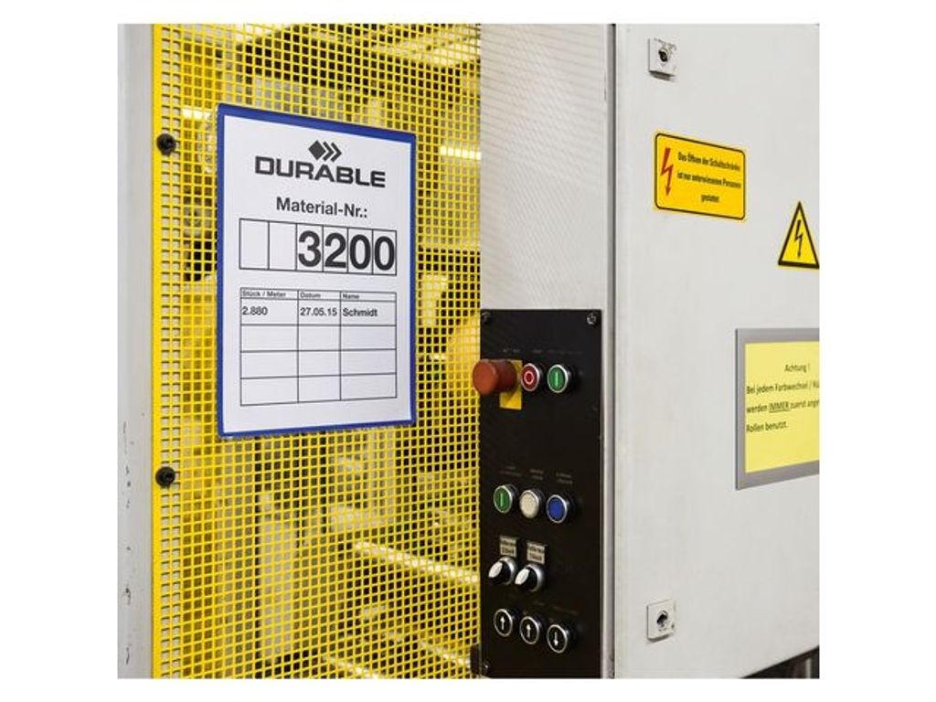 Tydlig och översiktlig märkning av skåp, dörrar, containrar och väggar av nätgaller som förbättrar och effektiviserar arbetsprocessen på lager och i produktionsanläggningar. Plastfickorna av slitstark polypropylene går att läsa med skanner. Ett lock gör att inlagan skyddas mot smuts och fukt även utomhus. Fästs med två pilformade band som träs igenom hålen i fickans överkant och sitter sedan ordentligt fast på gallret. Gratis mall för etiketten finns på www.duraprint.se. - Innermått: A5L (210x148 mm B x H) - Yttermått: 223x387 mm (B x H)