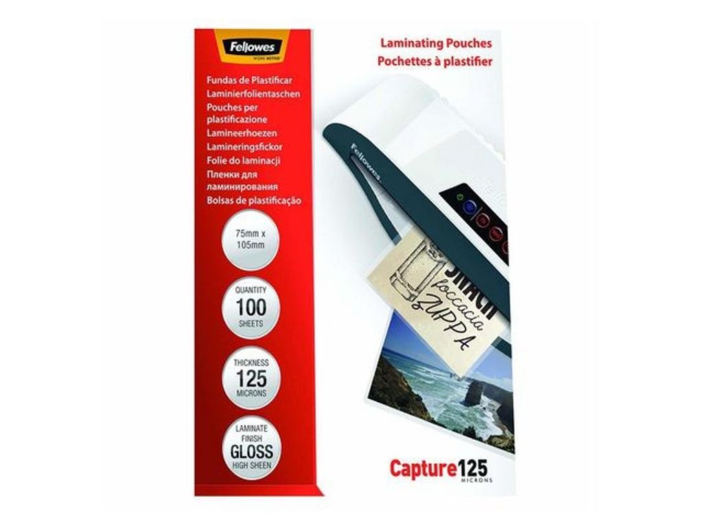Beskrivning av Laminat FELLOWES 75x105mm 125mic 100/fp Laminat FELLOWES 75x105mm 125 mic - Antal/fp: 100