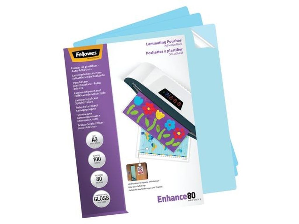 Beskrivning av Laminat FELLOWES S-H A3 80mic kla 100/fp Självhäftande lamineringsficka. Lamineringsficka för varmlaminering – med självhäftande baksida för enkel uppsättning. - I A3-format med en tjocklek på 80 my. - 100 st./fp