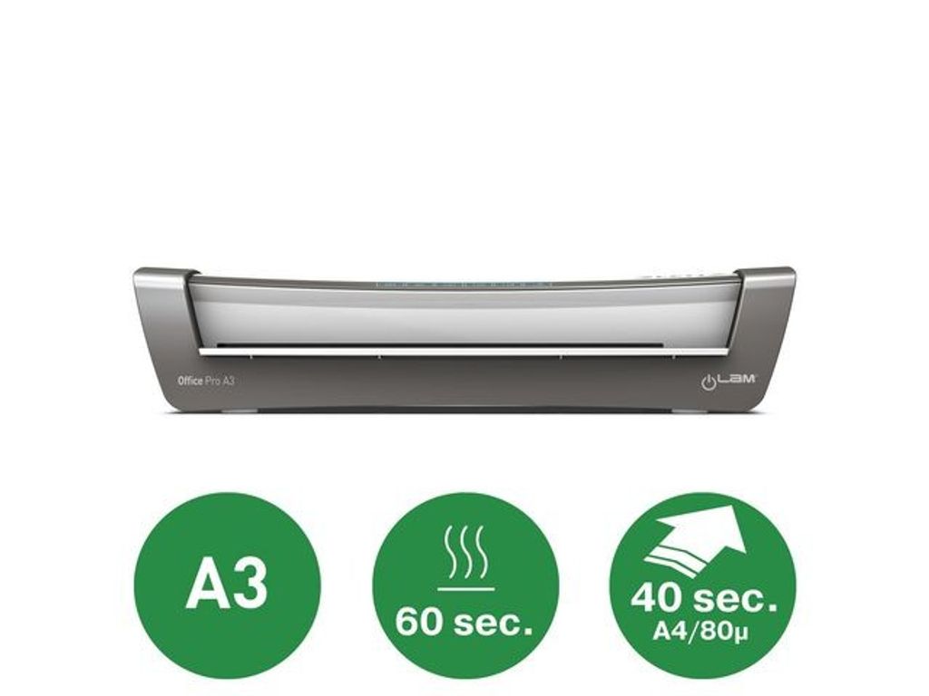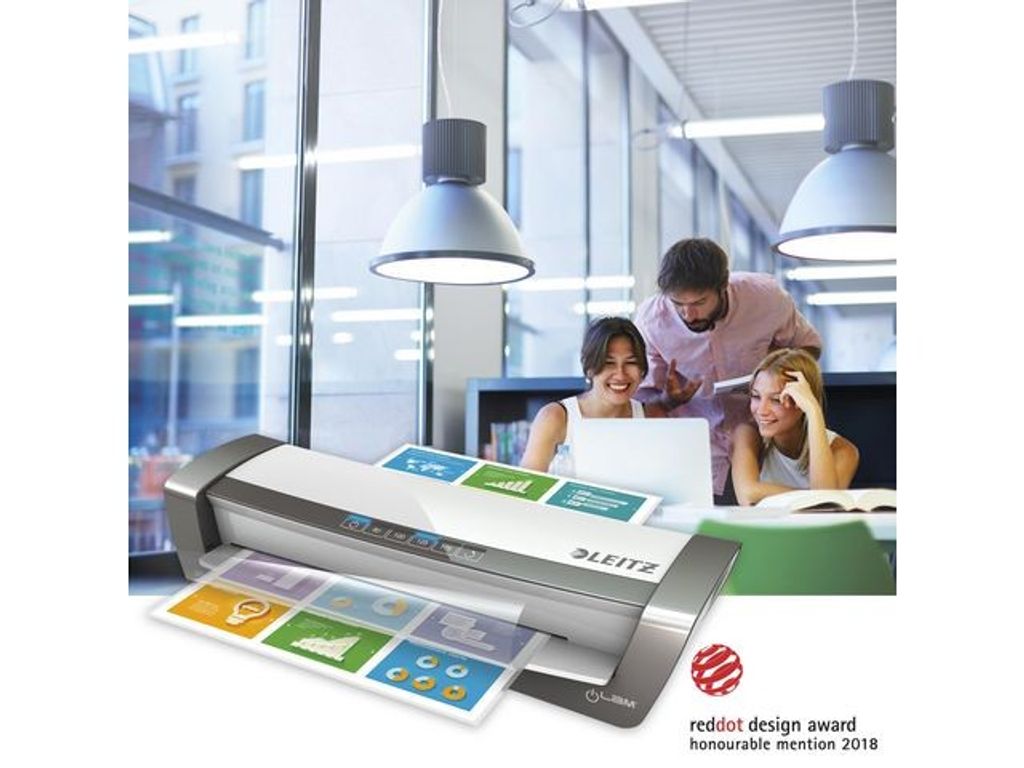 Med Leitz iLAM Laminator Office Pro A3 får du överlägsna resultat och den har bara 60 sekunders uppvärmningstid. För säker laminering och bästa resultat, ta dig tid att läsa maskinmanualen innan du börjar laminera. 5 inställningar plus backfunktion. Lämplig för 75-175 mikron. Bara en minuts uppvärmningstid. Hög prestanda för dagligt bruk kontor. Vi rekommenderar att man använder rengöringsark regelbundet eller efter varje användning för att förlänga maskinens livslängd. - Laminerar alla dokument upp till A3 - Värms upp på 60 sekunder - Använder fickor på 80 x 175 mikroner - Automatisk avstängning - Fart: Max 500mm/min - Färg: silver - Mått: 110 x 221 x 498mm - Garanti: 2 år - Skapa egna, anpassa eller skriv ut färdiga skyltar: https://signs.leitz.com/sv/se/7023/signmaker