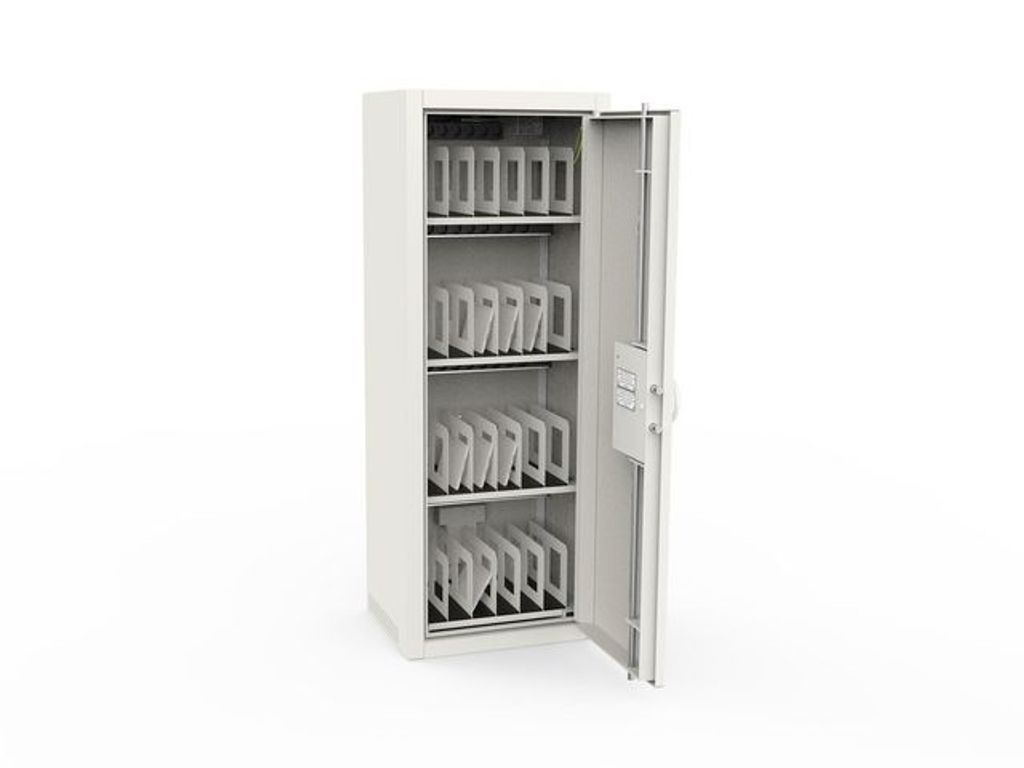 Säkerhetsklassade laptopskåp för förvaring av upp till 30st bärbara datorer. Skåpen är ventilerade och levereras med ett högsäkerhetsnyckellås med 2st medföljande nycklar. - Ljusgrå strukturlack, RAL 9002 - Standardutrustade med ett omställbart nyckellås. - Standardinredningen är 2-5 hyllor - Jordade och CE-märkta för säker användning. - Förberedda för fastbultning. (Bultar ingår inte). Skåp under 150kg bör förankras. - 240V uttag för laddning av dator och ventilation med fläkt - Stöldskyddscertifierade av SBSC enligt SSF 3492. - Standardutrustning: 4 hyllor, 1 fläkt - Rymmer antal laptops: 24st - Utvändiga mått: 1600 x 600 x 480 mm - Invändiga mått: 1592 x 592 x 395 mm - Vikt: 210kg
