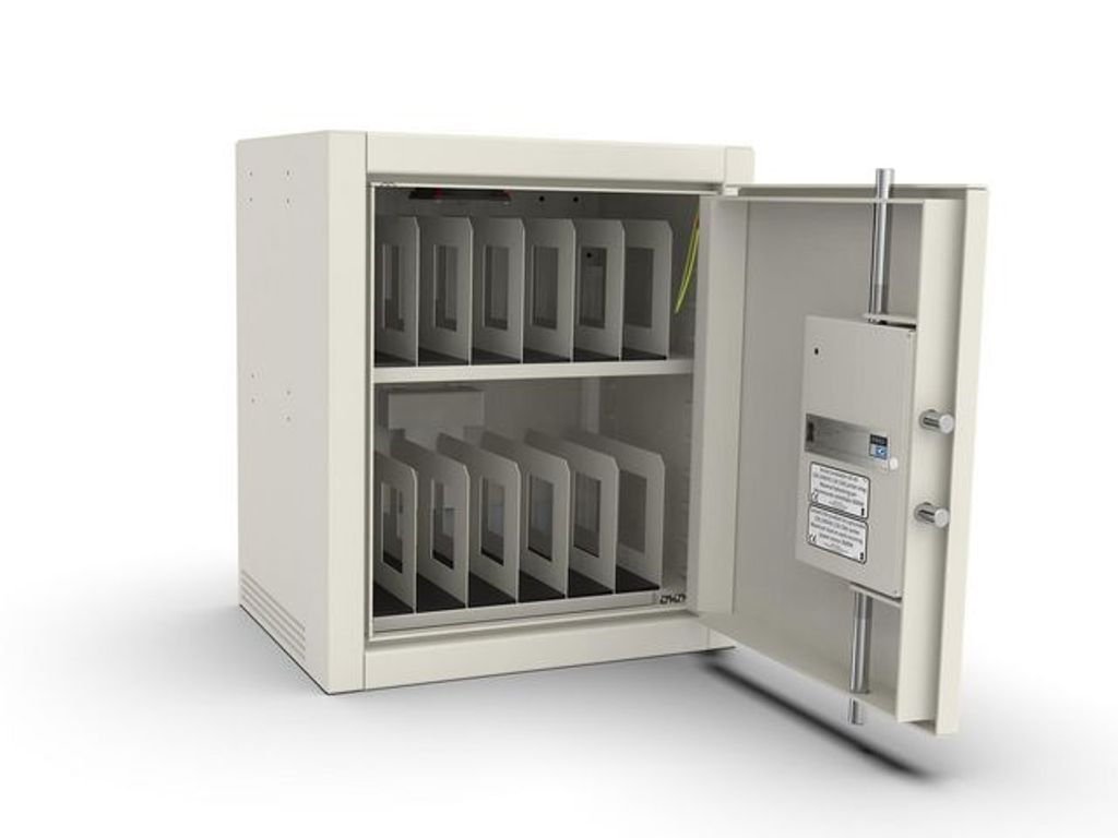 Säkerhetsklassade laptopskåp för förvaring av upp till 30st bärbara datorer. Skåpen är ventilerade och levereras med ett högsäkerhetsnyckellås med 2st medföljande nycklar. - Ljusgrå strukturlack, RAL 9002 - Standardutrustade med ett omställbart nyckellås. - Standardinredningen är 2-5 hyllor - Jordade och CE-märkta för säker användning. - Förberedda för fastbultning. (Bultar ingår inte). Skåp under 150kg bör förankras. - 240V uttag för laddning av dator och ventilation med fläkt - Stöldskyddscertifierade av SBSC enligt SSF 3492. - Standardutrustning: 2 hyllor, 1 fläkt - Rymmer antal laptops: 12st - Utvändiga mått: 700 x 600 x 480 mm - Invändiga mått: 692 x 592 x 395 mm - Vikt: 118kg