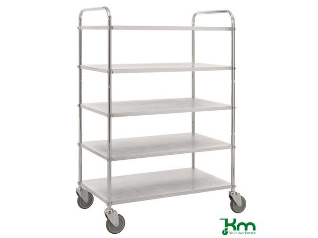 Elförzinkad hög plåtvagn i 5 plan. Hyllplanen kan monteras med kant upp eller ner efter eget önskemål. Rejäla 125mm hjul vilket gör den lätt att köra. Levereras omonterad. - Belastning: 250kg - Storlek: 980x585x1445mm (LxBxH) - Höjd till översta hyllplan: 1340mm - Avstånd mellan hyllplan: 250mm - Hyllplan 900x540mm - Färg: Silver - Vagnens vikt: 59kg - Bromsade hjul: Nej - Hjultyp: 4st länkhjul, 125mm