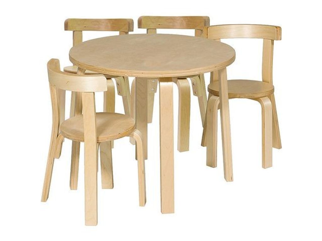 Kanonfint set med riktiga möbler av björk, som är anpassade för de yngre! Lekvråmöbelset med 1 bord och 4 stolar i björk. Mått på bordet: H 50 cm, diameter 70 cm. Höjd på stolarna är 50 cm, sitthöjd 30 cm.