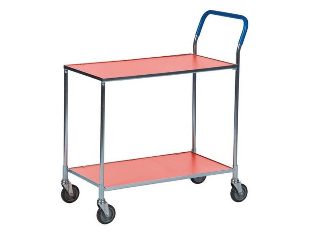 Praktiskt och lättmanövrerad vagn med greppvänligt handtag. En enkel och klassisk bordsvagn i 2 plan, perfekt på kontoret, lagret eller klassrummet. Plastbeklätt handtag som motverkar kalla händer. Hyllplan av laminat. Levereras med 4 länkhjul, elzinkat stativ och omonterad. - Belastning: 150kg (75kg/hyllplan) - Storlek: 850x435x950mm (LxBxH) - Höjd till första hyllplan: 180mm - Avstånd mellan hyllplan: 510mm - Hjultyp: 4 länk, 100mm - Bromsade hjul: Nej - Vganens vikt: 13,5kg - Färg: Röd