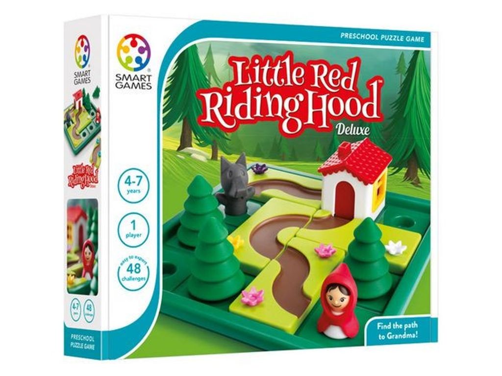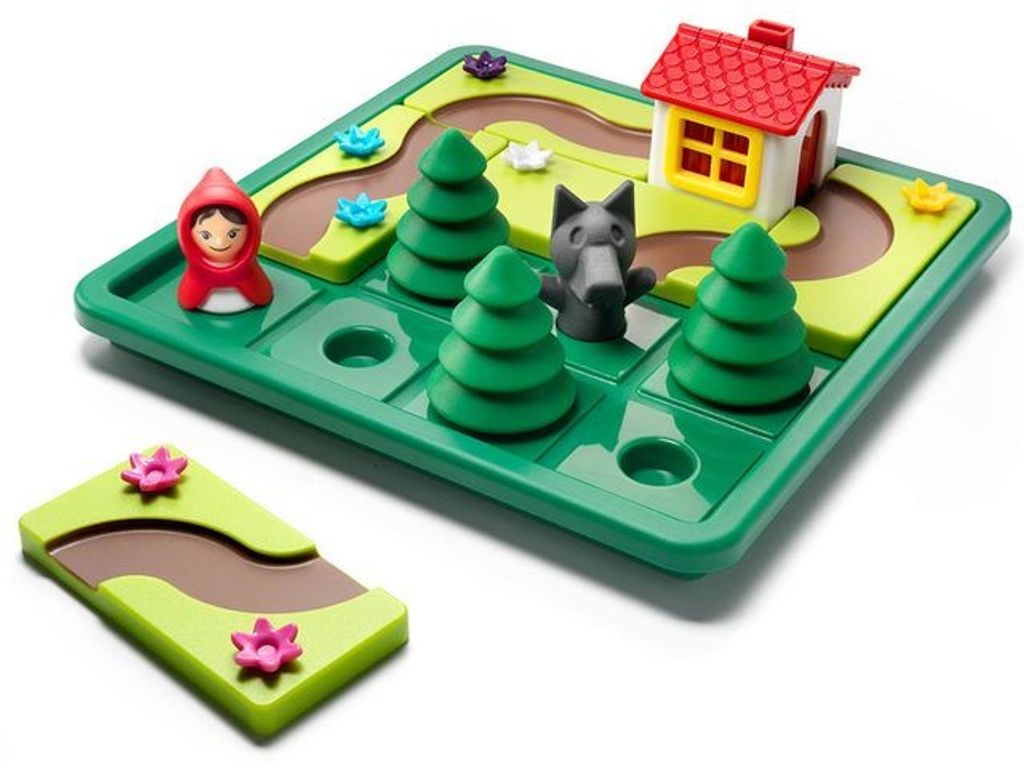 Ett spännande pusselspel med sagotema för de yngsta, även om äldre, föräldrar och andra också kan vara med och kan få nog så svårt att hitta lösningen. Snyggt förpackat med en tilltalande spelplan, med mormors hus, Rödluvan och vargen som plastfigurer och ett antal kluriga vägbitar där det gäller att hitta den rätta vägen till just mormors hus. Här gäller det att tänka logiskt, kreativt och rentav utmanande. Sammanlagt finns 48 olika sätt att placera hus, granar och figurer för att skapa olika korrekta vägar, från enklare till rena expertbanorna. Dessutom en liten bok som berättar hela sagan utan ord, så även de yngsta kan ”läsa” och förstå vad det handlar om.