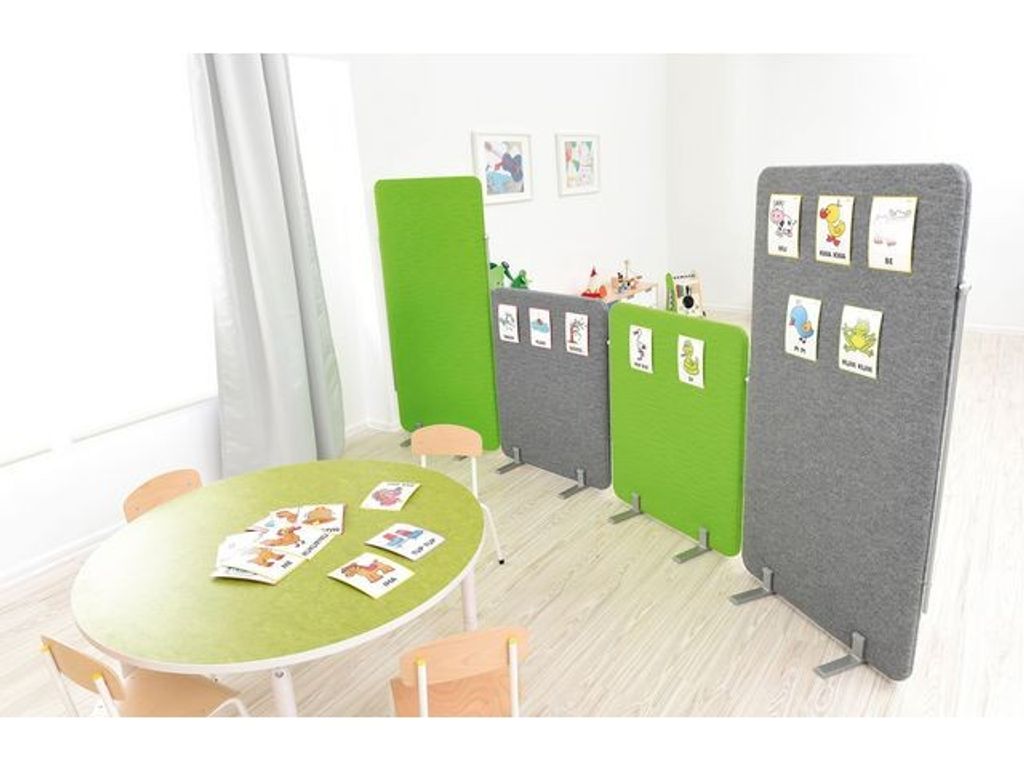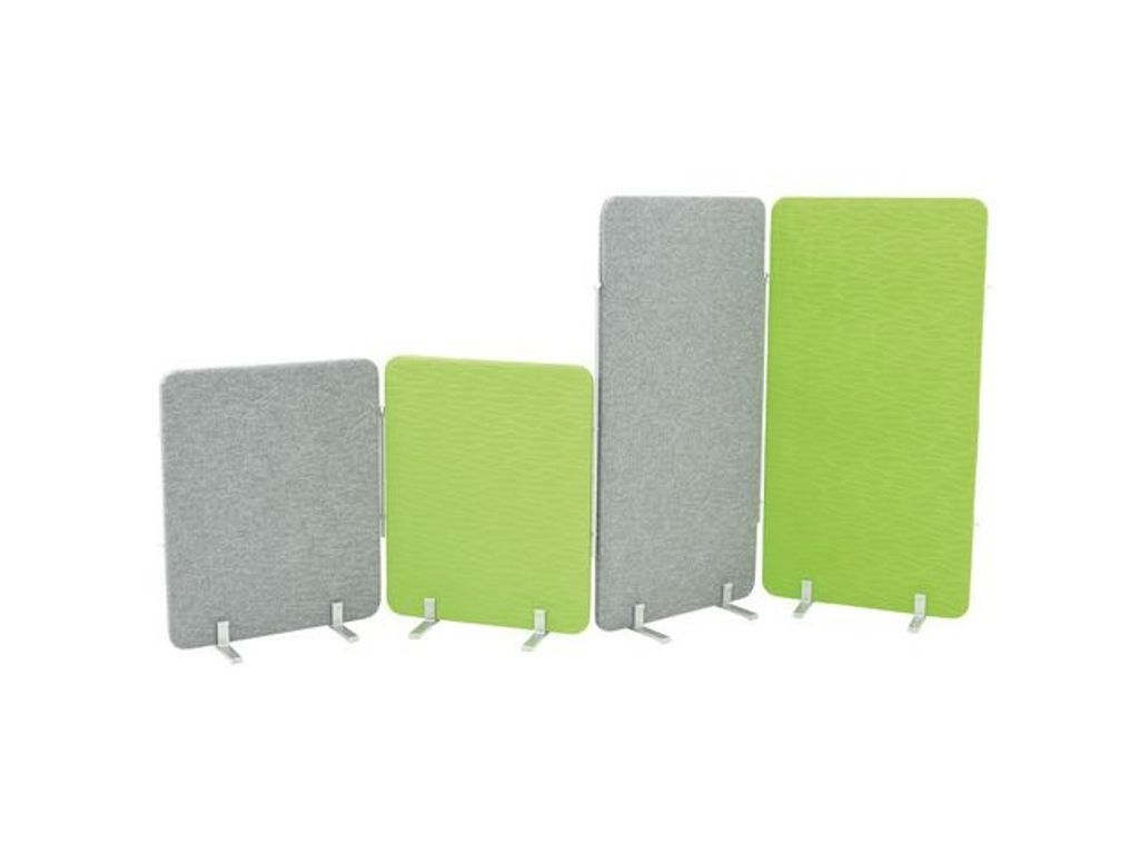 Ljudabsorberande skärm med styv ram och styrene-butadiene latex som är klädd i tyg (polypropylen) och stående på aluminiumfötter Det är möjligt att ansluta flera skärmar till varandra och ställa dessa i olika vinklar. Delar ingår för att sammankoppla flera skärmar. - Mått: 80,5x160cm