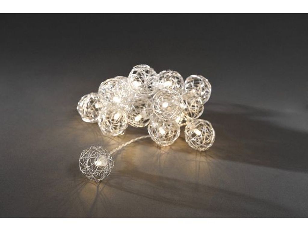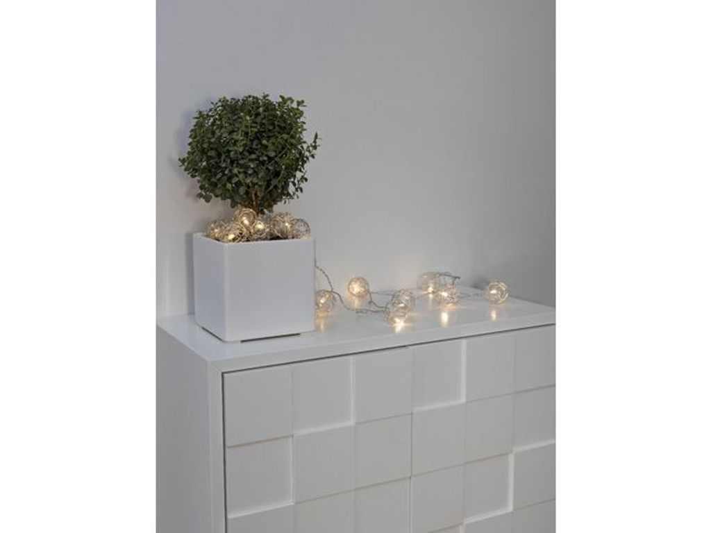 En batteridriven slinga att dekorera inomhus med. Varför inte använda den som pynt till juldukningen? Ljusslinga med 16 små aluminiumfärgade bollar i varmvita LED. Drivs med 3 x AA batterier. Transparent anslutningssladd 300cm. Slingans totallängd 525cm. - Färg: Silver - Ljusfärg: Varmvit - Antal lampor: 16 - Anslutningskabelns längd: 300cm - Ljusslingans längd: 225cm - Batteri: 3 x AA ingår ej - IP20 - För inomhusbruk