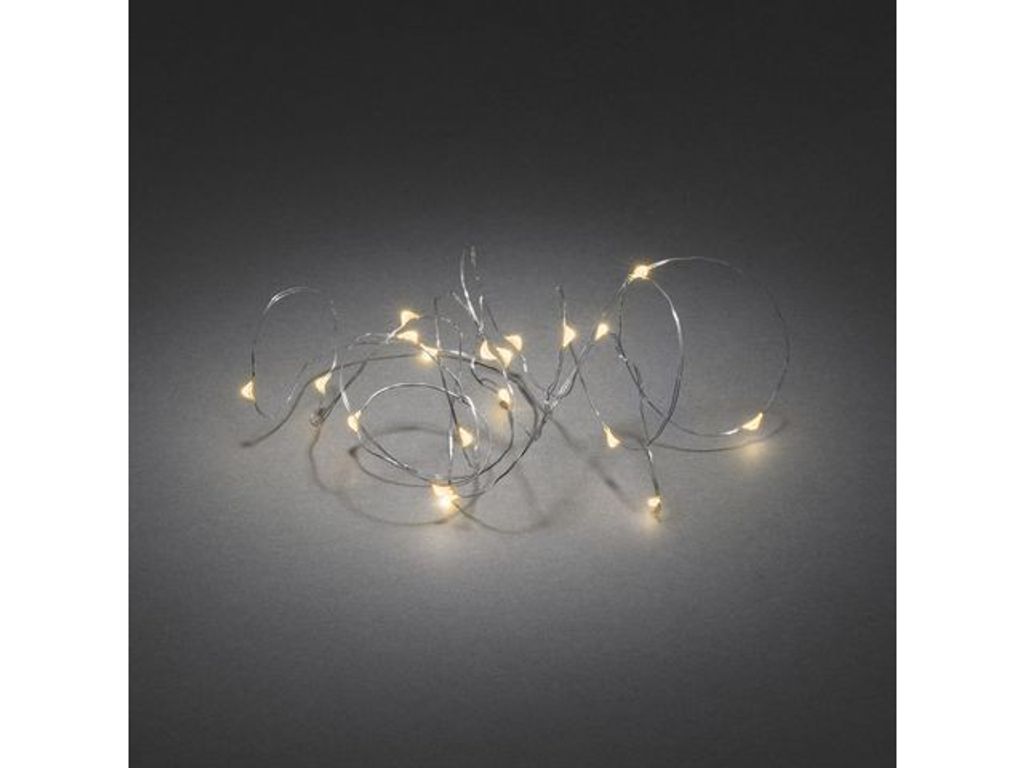 Skapa en trivsam stämning inomhus med denna ljusslinga i vackert varmvitt ljus. Microslinga i silverfärg på 1,9 meter med 20 amberfärgade LED. Perfekt att dekorera med. Drivs av 3xAA batterier (ingår ej) Har en timerfunktion på 6 timmar. Anslutningssladd på 50 cm. - Färg: Silver - Ljusfärg: Amber - Antal lampor: 20 - Anslutningskabelns längd: 50cm - Ljusslingans längd: 190cm - Timer: Ja, (6h) - Batteri: 3 x AA ingår ej - IP20 - För inomhusbruk