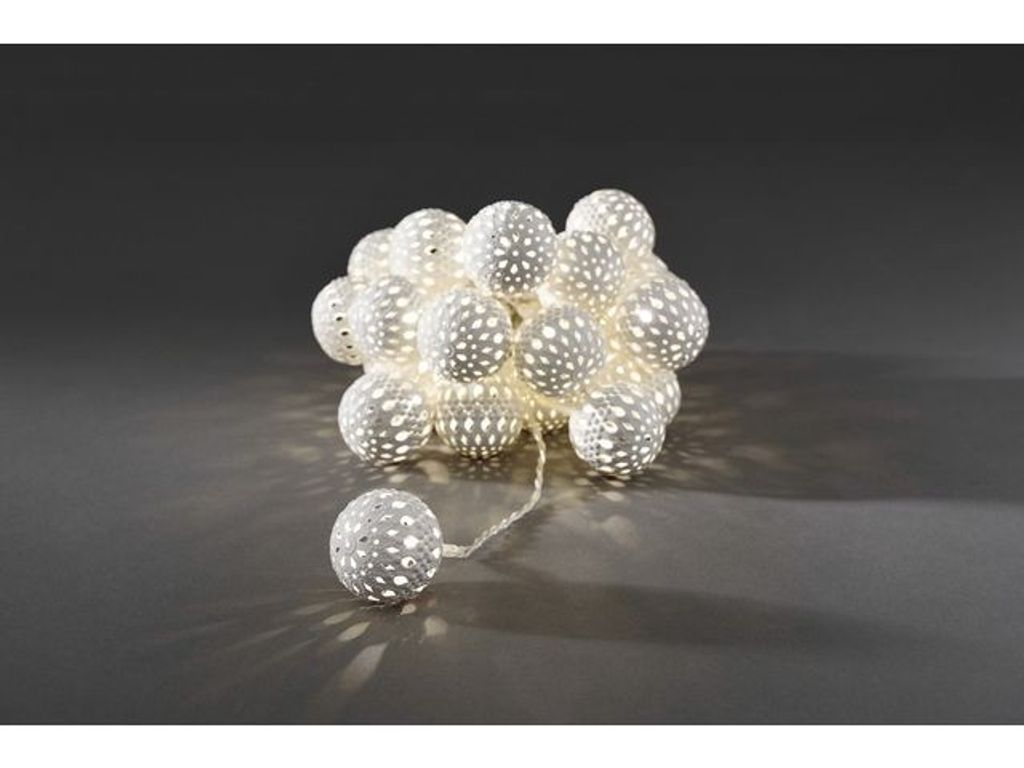 En vacker slinga i form av metallbollar att dekorera inomhus med. Varför inte använda den som pynt till juldukningen? Ljusslinga med 24 små vita metallbollar i varmvita LED. Drivs med en 24V transformator. Dimbar. Transparent anslutningssladd 300cm. Slingans totallängd 600cm. - Färg: Vit - Ljusfärg: Varmvit - Antal lampor: 24 - Anslutningskabelns längd: 300cm - Ljusslingans längd: 300cm - Transformator ingår - IP20/24V - För inomhusbruk