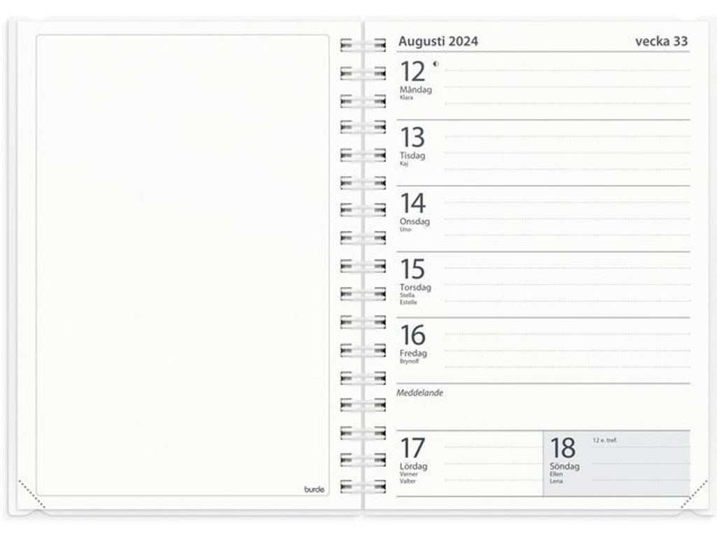 Kalender som används av elev/lärare tillsammans som underlag för planering m m. Även bra som kontaktbok mot föräldrar. - Format: A6. - Layout: Liggande. Vecka/Uppslag. Utbytbart motiv i plastficka. - Kalendarium: 2024-08-09 - 2025-08-17. - Omslag: PP-plast. Spiralbunden. - Detaljer: Gummiband. Plastfickor. - Innehåll: Årsplaner, schema, kontaktlista, klasslista, provresultat, anteckningar. - Antal sidor: 128. - Miljöinformation: FSC®.