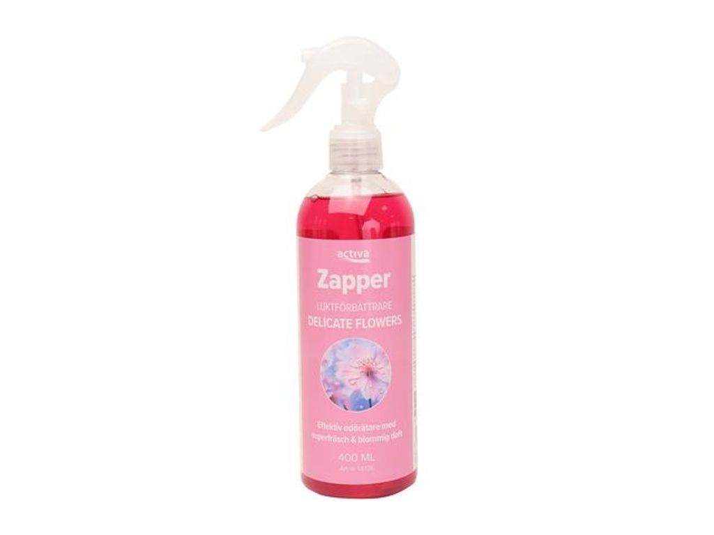 Långtidsverkande luktförbättrare i fräsch doft av blommor. Activa Zapper är en odörätare som sprider en fräsch och behaglig doft. Sprayen är testad och bevisat effektiv mot otrevliga lukter från tobaksrök, djur, matos, toaletter, mögel m.m. Spraytriggern ger en fin dusch som sprider en fräsch doft och snabbt äter upp obehagliga lukter, inte bara kamouflerar dem. Spraya Activa Zapper i luften där obehaglig lukt finns. Spraya efter behov och storlek på utrymmet. Normalt räcker det med 1-2 sprayningar. Undvik att spraya på textilier eller känsliga ytor. - Volym: 400 ml - 1400 sprayningar/flaska