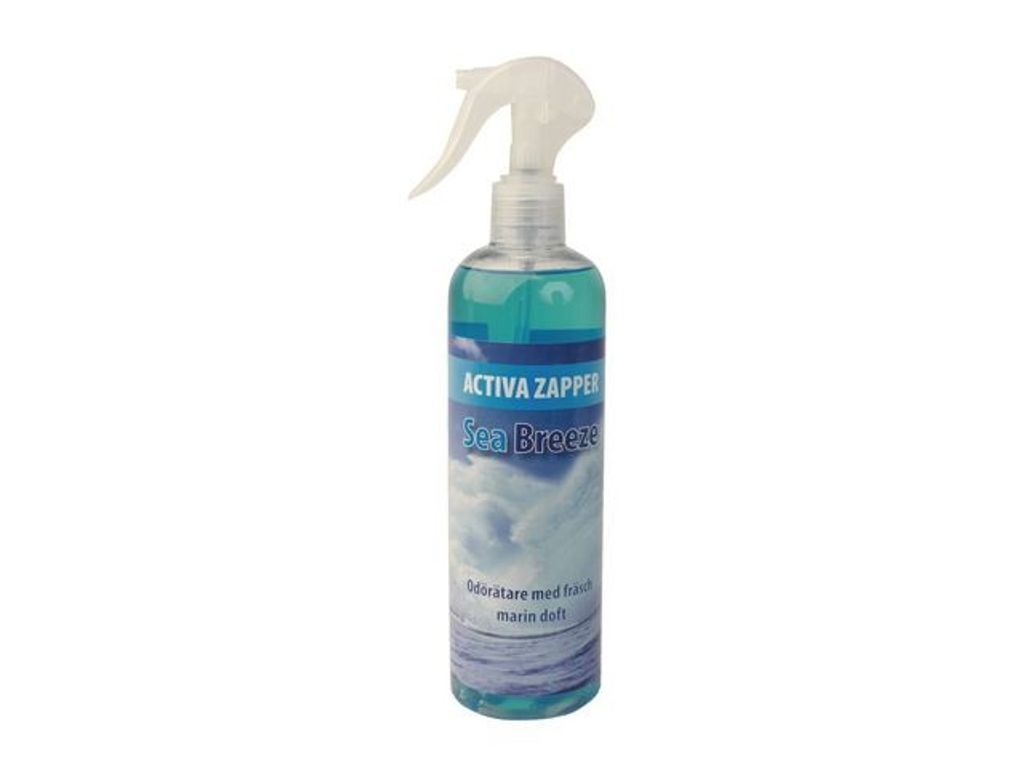 Långtidsverkande luktförbättrare i fräsch doft av hav. Activa Zapper är en odörätare som sprider en fräsch och behaglig doft. Sprayen är testad och bevisat effektiv mot otrevliga lukter från tobaksrök, djur, matos, toaletter, mögel m.m. Spraytriggern ger en fin dusch som sprider en fräsch doft och snabbt äter upp obehagliga lukter, inte bara kamouflerar dem. Spraya Activa Zapper i luften där obehaglig lukt finns. Spraya efter behov och storlek på utrymmet. Normalt räcker det med 1-2 sprayningar. Undvik att spraya på textilier eller känsliga ytor. - Volym: 400 ml - 1400 sprayningar/flaska