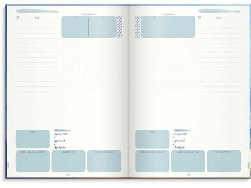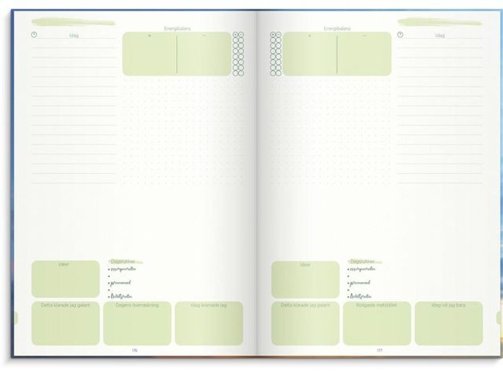 Positiv kalender för att logga sitt mående. Bli medveten om positiva och negativa händelser i livet för att få bättre självkänsla och en gladare vardag. Sex månaders odaterat kalendarium som delats upp i olikfärgade perioder om fyra veckor. - Format: 176x250mm (B5) - Omslag: Kartongomslag med struktur. - Inbunden - Innehåll: 100 g cremefärgat papper - Antal sidor: 128 blad (256 sidor) - Detaljer: Två märkband