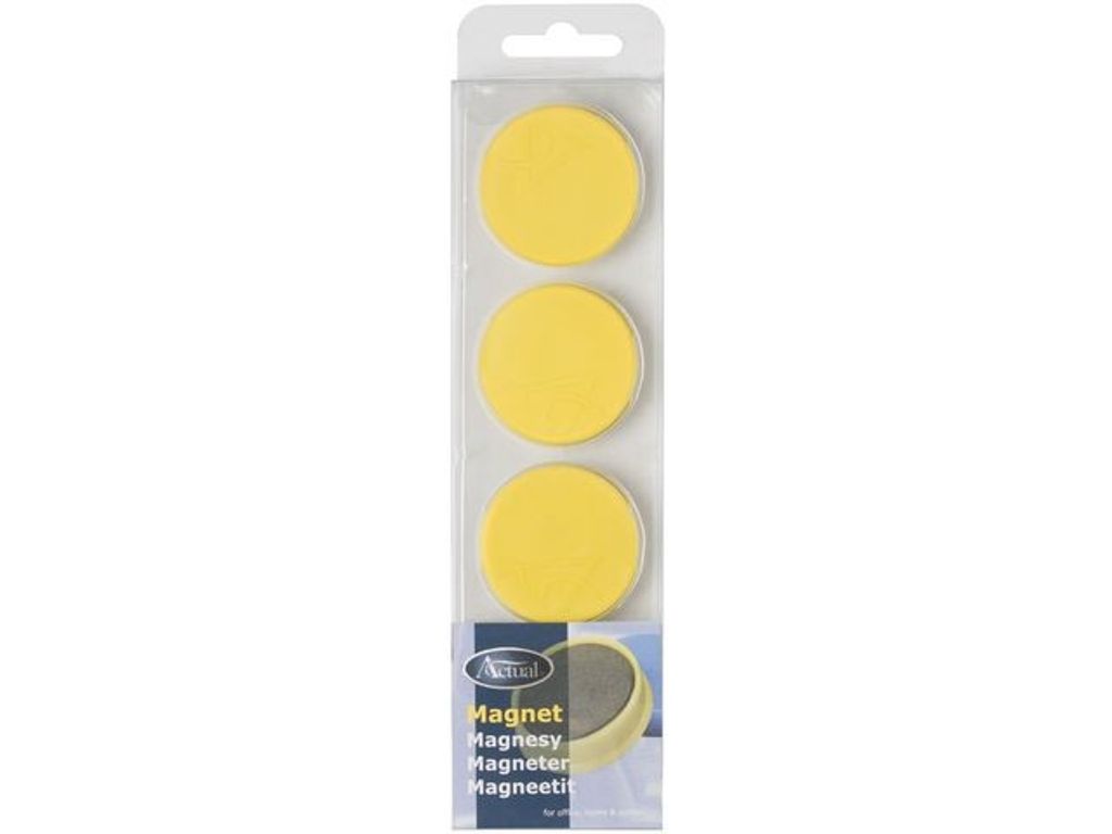 Beskrivning av Magnetknappar ACTUAL 40mm gul 4/fp Perfekt för din whiteboard! Häng upp dina dokument, teckningar, anteckningar med dessa magneter. Passar på whiteboards och kylar. Passar inte glastavlor! - 4/fp - 40mm