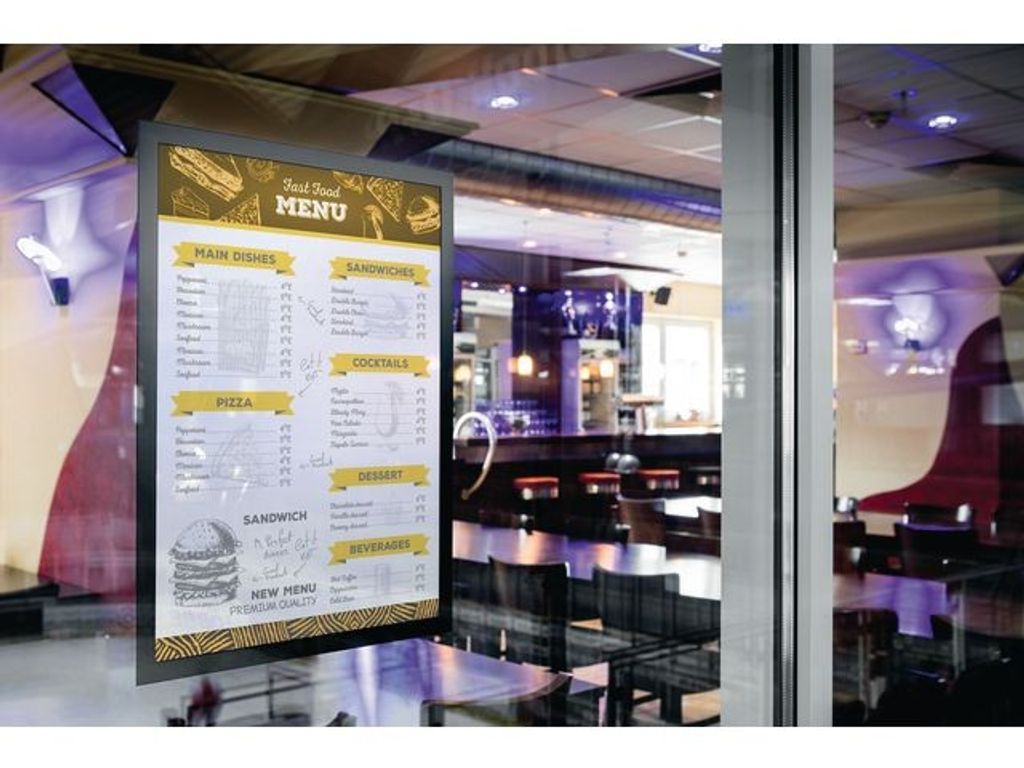 Inforam som fäster statiskt på glasrutor. För olika typer av information i A3 format som exponeras för solljus. UV-stabil och värmetålig. Använd DURAFRAME® SUN inforamar för att visa och presentera kampanjerbjudanden, öppettider, reklam mm på ett proffsigt sätt i skyltfönster som utsätts för solljus. Enkelt att sätta i eller skifta budskap genom att lyfta framsidan med magnetstängning. Lätt att sätta upp - spraya bara lite vatten utblandat med en droppe diskmedel på baksidan så fäster ramen statiskt på glasytan. Snyggare än tejp! Kan användas flera gånger och lämnar inga spår efter sig. Ramen är läsbar från två håll och du kan visa olika budskap på de båda sidorna. Tillverkad av PVC. - UV-resistent skyltram - Värmetålig upp till 70 °C - Ett professionellt och enkelt sätt att visa budskap - Fäst den självhäftande baksidan på någon slät, fast yta - Flyttbara på glas/fönster - Inga kladdiga rester på ytor - För papper i A3-format - Använd i stående eller liggande format - Ramens storlek: 323 x 446 mm - Färg: Svart - Antal: 2