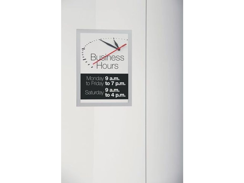 UV-resistent DURAFRAME® Sun är en självhäftande, magnetisk skyltram som är perfekt för att visa notiser, skyltar, meddelanden och affischer m.m. på glasytor som är utsatta för ljus. Den magnetiska inforamen DURAFRAME® Sun är ett enkelt och effektivt sätt att visa skyltar, affischer och alla andra typer av budskap. Dra av skyddspapperet och placera den självhäftande baksidan på en slät och fast yta, som ett fönster, så att informationen kan läsas från båda sidorna. Med den magnetiska tätningen ser du till att innehållet sitter ordentligt. Med den vikbara magnetiska framsidan kan du dessutom lätt ta bort och byta innehåll. När du sätter upp affischerna på glasytor och fönster kan de flyttas utan att lämna spår. Ramen är läsbar från två håll och du kan visa olika budskap på de båda sidorna. Tillverkad av PVC. - UV-resistent skyltram - Värmetålig upp till 70 °C - Ett professionellt och enkelt sätt att visa budskap - Fäst den självhäftande baksidan på någon slät, fast yta - Flyttbara på glas/fönster - Inga kladdiga rester på ytor - För papper i A4-format - Använd i stående eller liggande format - Ramens storlek: 236 x 323 mm - Färg: Silver