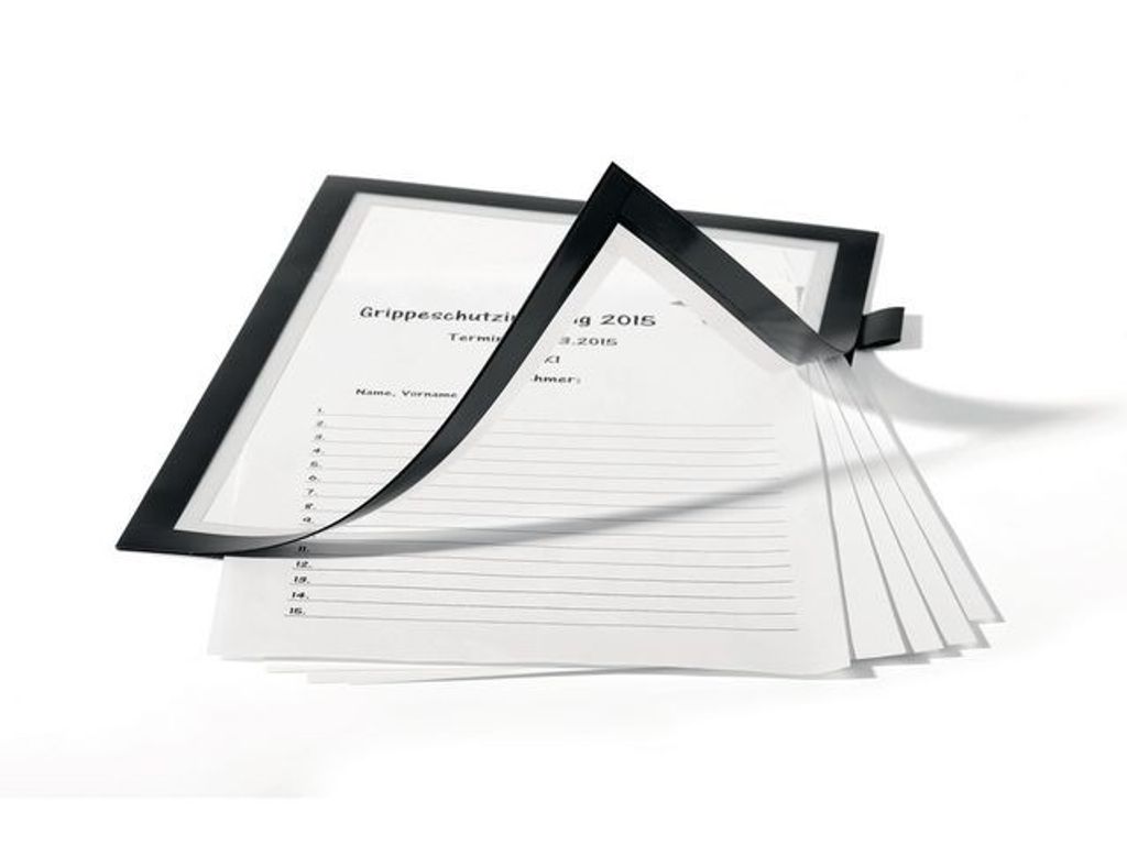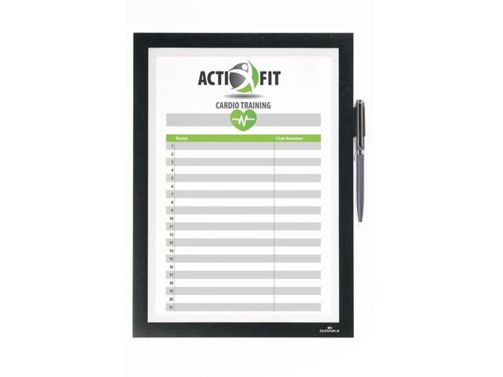Lättanvänd, självhäftande inforam för noteringar direkt på pappret. För A4-format. Använd självhäftande DURAFRAME® NOTE inforamar för t ex checklistor där noteringar skall göras direkt på pappret. Enkelt att sätta i eller byta listor genom att lyfta framsidan med magnetstängning. Lätt att sätta upp - utan verktyg eller andra tillbehör - på fasta och släta ytor. Rymmer upp till 5 st 80 gr A4 ark som t ex städscheman, registreringslistor eller underhållskontroller där man behöver göra noteringar direkt på arket. Pennhållare på ena sidan. Ramen ser likadan ut på fram och baksidan och sätts den upp på glas kan informationen läsas från två håll. Ramen går att ta bort från glasrutor. Undvik att fästa självhäftande DURAFRAME® på målade, belagda eller laminerade ytor samt underlag som tapeter, porösa material och non-stick ytor. Dessa ytor kan skadas om ramen tas bort. - Storlek: A4 - Färg: Svart - Antal: 1