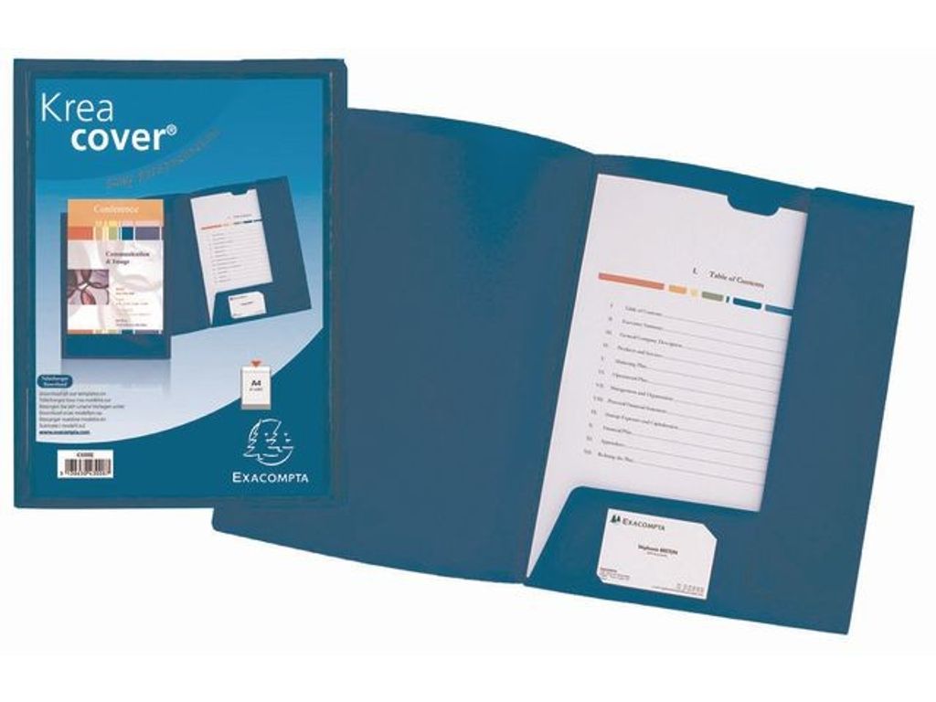 Presentationsmappen Exacompta Kreacover® har en genomskinlig ficka i A4-format på framsidan, så att den kan anpassas efter dina önskemål. Presentationsmappen Exacompta Kreacover® är perfekt att använda som en projektmapp eller som en mapp för att presentera verksamhetsrapporter och andra viktiga dokument. Det går att skräddarsy mappen eftersom dess framsida har en genomskinlig A4-ficka där du kan lägga in en egen rubriksida. Den här praktiska presentationsmappen har en mjuk pärm och rymmer 200 A4-papper. Den har 2 tillhörande flikar på insidan som håller innehållet på plats. Dessutom finns det en slits på den undre fliken där du enkelt kan förvara ett visitkort. Den här mappen håller hög kvalitet, lång livslängd och är tillverkad av innovativ polypropylen. - Förvaringskapacitet: Rymmer 100 A4-papper - Genomskinlig A4-ficka på framsidan för anpassning av rubriksidan - Mjuk pärm - Material: hållbar polypropylen - Mått: 240 x 320 mm - Tjocklek: 0,4 mm - Färg: Blå
