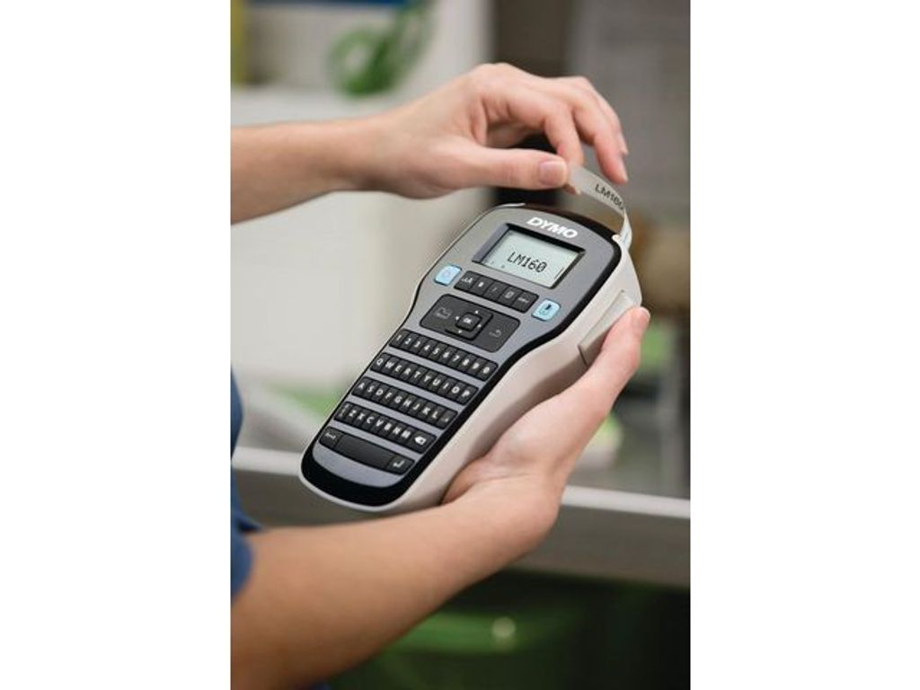 Med den lättanvända bärbara LabelManager™ 160 från DYMO® kan du skriva ut etiketter som du alltid velat ha dem. 3 extra Tape-kassetter medföljer, D1 tape 12mm Svart på vit. LabelManager märkmaskin gör det enkelt att organisera och ger högkvalitativa resultat. Märkmaskinen LabelManager 160 från DYMO® är en handhållen och fristående enhet. Med 288 symboler och ett Clip Art-bibliotek kan du ge dina etiketter ett mångsidigt och professionellt utseende. Den grafiska skärmen på LabelManager 160 från DYMO ger en tydlig bild av hur din etikett kommer att skrivas ut. Du behöver inte gissa dig till hur etiketten kommer att se ut. Enheten kan spara senast utskrivna etikett och skriva ut den igen med en knapptryckning. Enheten använder färdigförpackade D1-tejprullar med termisk överföring med maximalt 12 mm bredd som finns i permanenta och icke-permanenta material. - 3 extra Tape-kassetter medföljer, D1 tape 12mm Svart på vit - Förpackningen är producerad utav återvunnet material - Lokaliserad QWERTY-tangentbordslayout - Med LCD-skärmen kan du förhandsgranska texter före utskrift - Snabbtangenter med en knapptryckning som gör det enkelt att justera textstorlek, fetstil, kursiv, understrykning/ram och vertikal text - Välj mellan 6 teckenstorlekar, 8 textstilar, 4 ramar plus understrykning - Snabbtangent för att infoga skiljetecken - 228 symboler och clip art-bilder - Använder 6 alkaliska AAA-batterier, ingår ej eller AC-strömadapter - Ingen USB-anslutning - Använder D1-tejprullar - 2 utskiftsrader