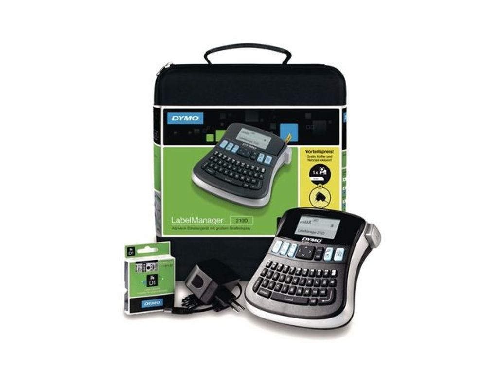 Med den lättanvända LabelManager™ 210D från DYMO® kan du skriva ut etiketter som du alltid velat ha dem. LabelManager märkmaskin gör det enkelt att organisera och ger högkvalitativa resultat. Etikettskrivaren LabelManager 210D från DYMO® är en fristående enhet för skrivbordet. Med 6 teckensnitt, 7 olika stilar och 8 olika ramar ger maskinen flexibilitet. Den grafiska displayen på LabelManager 210D ger en tydlig bild av hur din etikett kommer att skrivas ut. Du behöver inte gissa dig till hur etiketten kommer att se ut. Enheten kan spara senast utskrivna etikett och skriva ut den igen med en knapptryckning. Enheten använder färdigförpackade D1-tejprullar med termisk överföring med maximalt 12 mm bredd som finns i permanenta och icke-permanenta material. - Förpackningen är producerad utav återvunnet material - Lokaliserad QWERTY-tangentbordslayout - Navigeringsknappar för enkel åtkomst till menyfunktioner - Snabb åtkomst till symboler och diakritiska tecken - Automatisk avstängning för att spara batteritid och ge skrivaren längre livstid - Välj mellan 6 teckenstorlekar, 7 stilar och 8 olika ramar - Används med 6 AA-batterier, ingår ej - Passar fint på skrivbordet - Ingen USB-anslutning - Använder D1-tejprullar - I det här kitet medföljer även: 1 x D1 12mm Svart på Vit, Väska och AC-adapter
