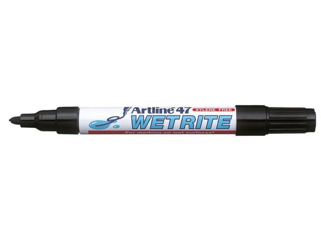 Idealisk för märkning på våta icke porösa ytor som metall, plast, gummi, plåt, sträckfilm och frigolit etc. Märkpenna 47 Wetrite för att skriva och märka på våta underlag. Pennan kan inte användas på våt kakel eller vått glas. - Permanent märkpenna - Spets: 1,5 mm - Rund spets - Snabbtorkande - Alkoholbaserat permanent tusch utan Xylen - Färg: svart
