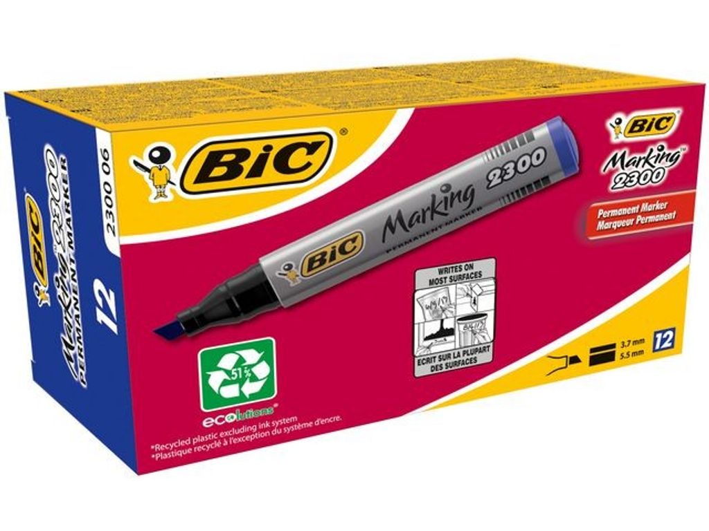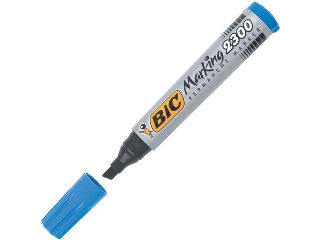 BIC® Marking™ 2300 permanent märkpenna skriver med väder- och ljusbeständigt bläck på de flesta ytor. BIC® Marking™ 2300 permanent märkpenna med bläck som ger klara och livfulla färger. Det permanenta bläcket kan användas på de flesta ytor, t.ex. papper, glas, plast och textilier. Märkpennan har en medellång snedskuren spets som gör det enkelt att skriva med olika stilar. Bläcket har svag lukt för en behagligare upplevelse. - Permanent bläck - Med huv - Snedskuren spets - Linjebredd: 3,1–5,3 mm - Textfärg: Blå
