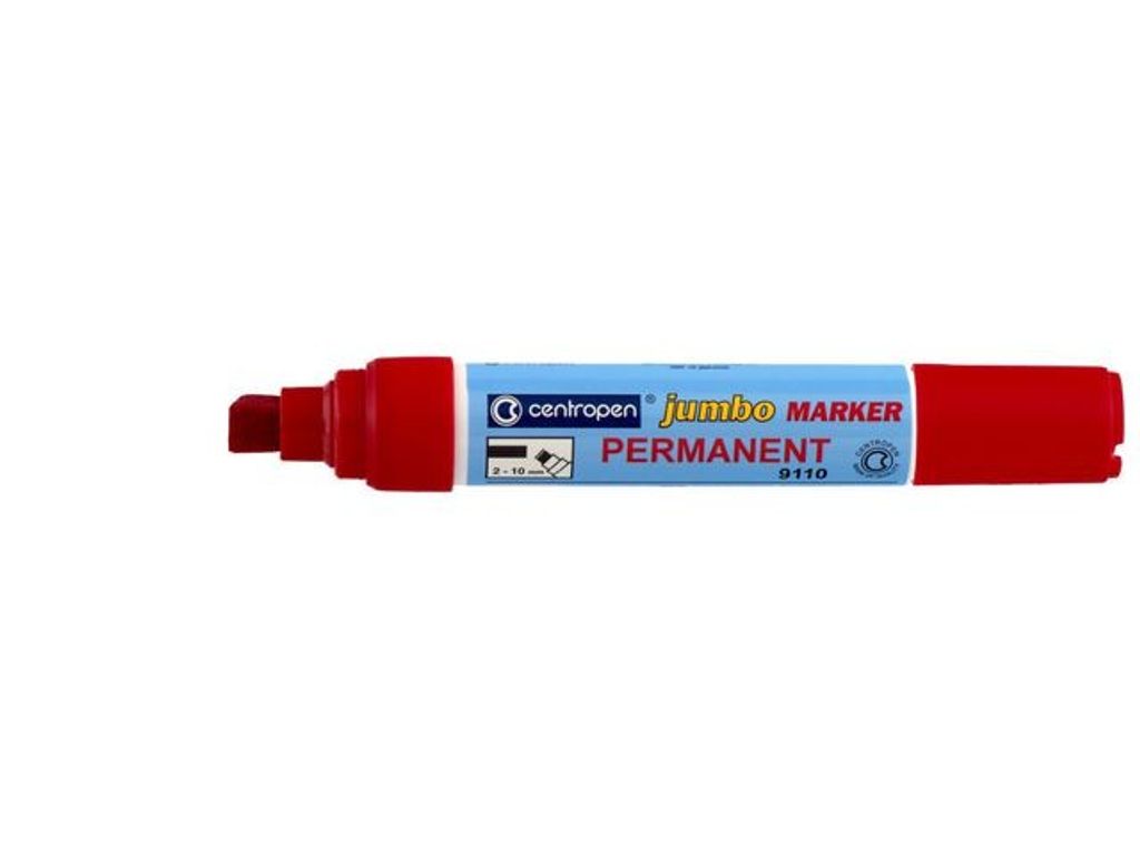 Märkpenna CENTROPEN jumbo röd med snedskuren spets som går att använda på de flesta underlag. - Permanent bläck - Med huv - Snedskuren spets - Linjebredd: 2-10 mm - Textfärg: Röd - Färg pennkropp: Blå/röd