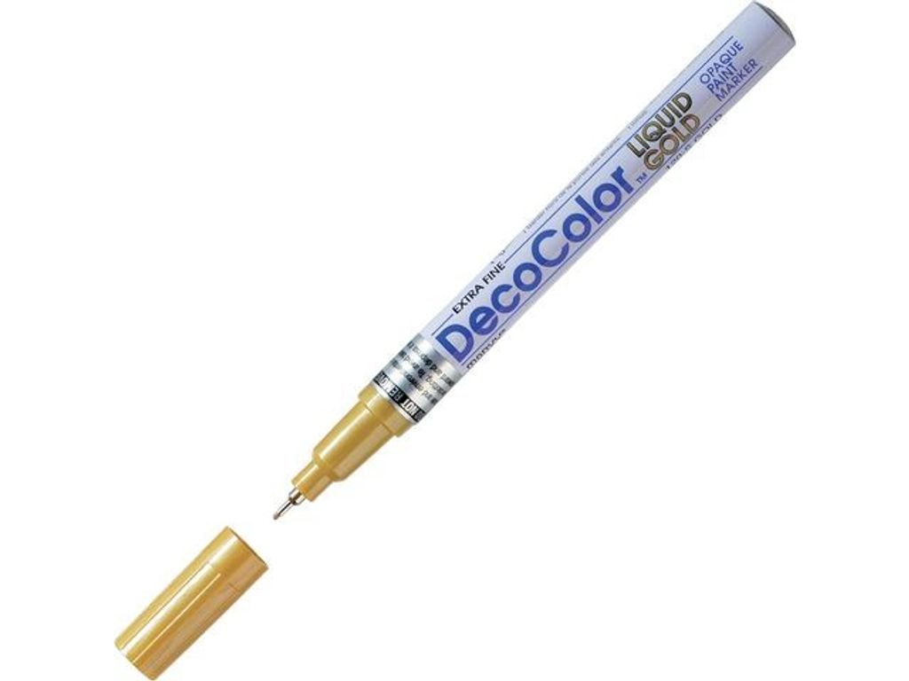 Använd Marvy® Uchida DecoColor® märkpenna vid nästa hantverksprojekt då den har en supertunn fiberspets som passar perfekt för exakt skrift. Marvy® Uchida DecoColor® märkpenna är vattentät, vilket gör den lämpad för alla konst- och hantverk. Den kan användas för detaljerade ritningar eller skrift på glas, trä, sten, lera, speglar och porslin. Denna märkpenna med fjäder måste skakas före användning och pressas mot ytan för att få ett jämnt flöde. - Permanent bläck - Med huv - Rund spets - Textfärg: Guld