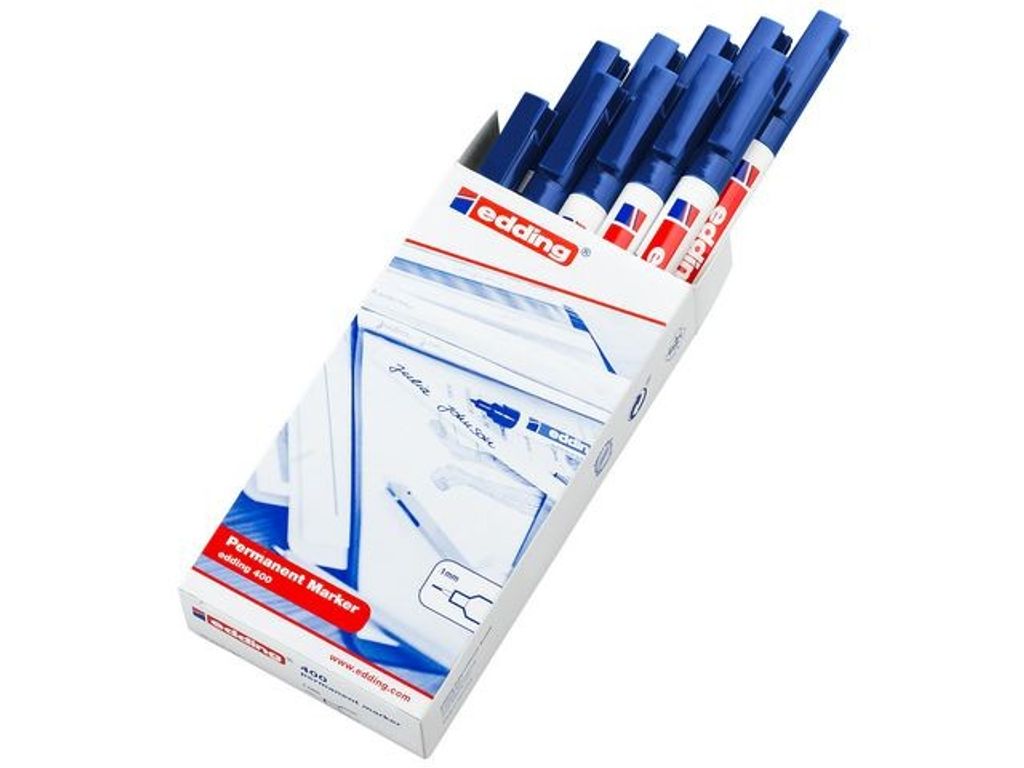 Den permanenta märkpennan Edding 400 är utformad för mångsidig användning och kan användas på nästan alla slags ytor. Den här permanenta märkpennan innehåller bläck som torkar snabbt och är smetfritt och vattenbeständigt, vilket hjälper dig att skriva tydligt och fläckfritt. Den är speciellt utformad för mångsidig användning och kan användas i flera olika sammanhang. Den permanenta märkpennan Edding 400 har en tunn spets som ger 1 mm linjebredd och den passar utmärkt när du vill ha mer precision och noggrannhet. Det ger jämn skrift på nästan alla slags ytor, bland annat plast, metall, glas och trä. Märkpennan är tunn och lätt, vilket gör den extremt bekväm och enkel att använda. Den levereras med kork och fickklämma. - Permanent bläck - Med huv - Rund spets - Linjebredd: 1 mm - Textärg: Blå