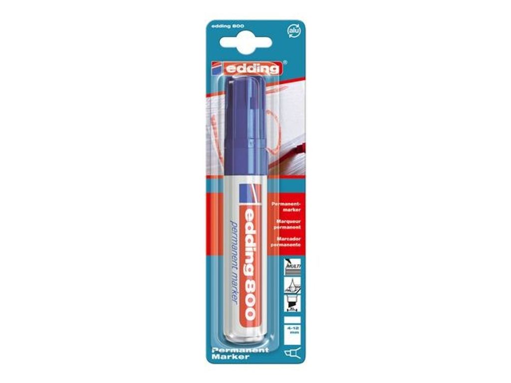 Den permanenta märkpennan Edding 800 är utformad för mångsidig användning och kan användas på nästan alla slags ytor. Den här permanenta märkpennan innehåller bläck som torkar snabbt och är smetfritt och vattenbeständigt, vilket hjälper dig att skriva tydligt och fläckfritt. Den är speciellt utformad för mångsidig användning och kan användas i flera olika sammanhang. Den permanenta märkpennan Edding 800 har en bred, snedskuren spets som ger 4 - 12 mm linjebredd och passar utmärkt när du vill ha fet och flödande text. Märkpennan kan användas på nästan alla slags ytor, bland annat plast, metall, glas och trä. Dess jumbostorlek innebär att märkpennan är enkel att greppa och håller länge. - Permanent bläck - Med huv - Pennkropp av aluminium - Snedskuren spets - Linjebredd: 4 - 12 mm - Textfärg: Blå