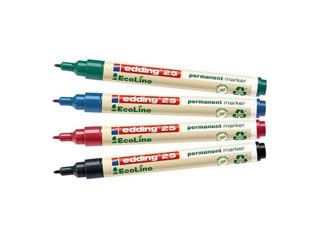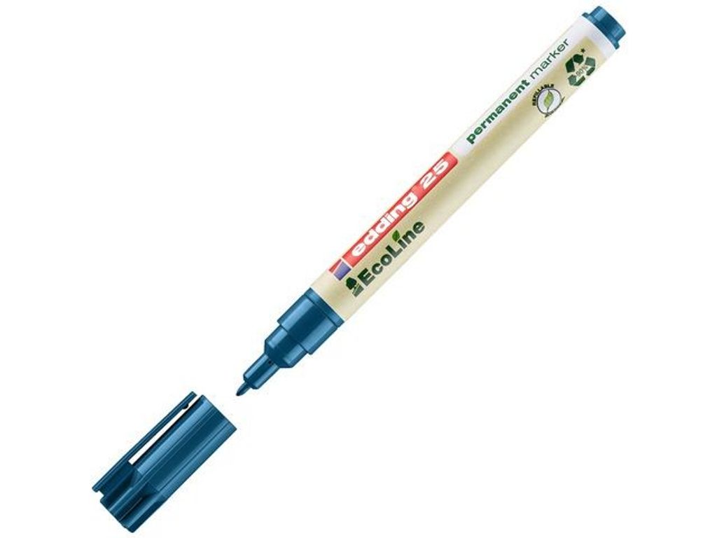Med den permanenta märkpennan Edding 25 EcoLine kan du skriva på nästan alla ytor, och den består av plast som är tillverkat av 90 % återvunnet material. Den här permanenta Edding 25-märkpennan för finskrift står ut tack vare dess miljömedvetna material. Märkpennan har en kulformad spets med ett ungefärligt linjedrag på 1 mm och tack vare sitt ljusfasta och slitstarka bläck är den idealisk för användning på nästan alla ytor, som t.ex. plast, metall, glas, osv. Dess alkoholbaserade bläck har svag lukt och är fritt från xylen och toluen. Märkpennan Edding 25 är precis som alla andra permanenta märkpennor från EcoLine-sortimentet tillverkad av 90 % återvunnet material. - Permanent bläck - Med huv - Rund spets - Linjebredd: cirka 1 mm - Textfärg: Blå