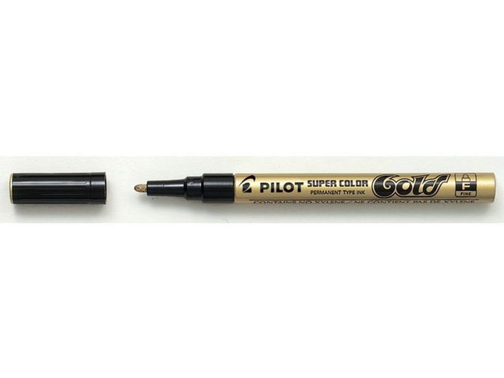Pilot Super Color är en märkpenna med tunn spets som ger djupa, starka färger och kan användas på nästan vilken yta som helst. Med Super Color-märkpennan från Pilot får du klara och täta linjer som gör att det du skriver eller ritar sticker ut. Du kan använda den på nästan alla ytor, inklusive glas, trä, metall, plast och gummi. Märkpennan har en tunn spets på 3,0 mm som producerar en linje på 1,0 mm och gör den perfekt för uppgifter som kräver noggrannhet. Dessutom innehåller den ett speciellt xylenfritt bläck som inte luktar så starkt, vilket gör den mycket trevligare att skriva med. Märkpennan har en slimmad lättviktsdesign som gör det avslappnat och otvunget att använda den. - Permanent bläck - Med huv - Rund spets - Spetsbredd: 3,0 mm - Linjebredd: 1,0 mm - Textfärg: Guld