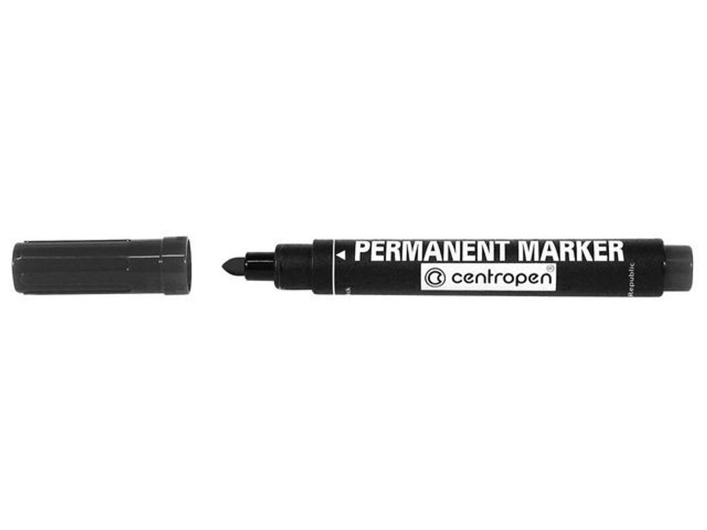 centropen® 8566 märkpennor är lämpliga för användning på glas, plast, trä, speglar och andra ytor. Dessa centropen® 8566 märkpennor har en spets som möjliggör exakt skrift. Det alkoholbaserade, permanenta bläcket är vattenfast och slittåligt. Du kan enkelt skriva, klottra eller rita på glas, plast och andra ytor med dessa märkpennor. De har en linjebredd på 2,5 mm. - Permanent bläck - Med huv - Rund spets - Linjebredd: 2,5 mm - Textfärg: Svart