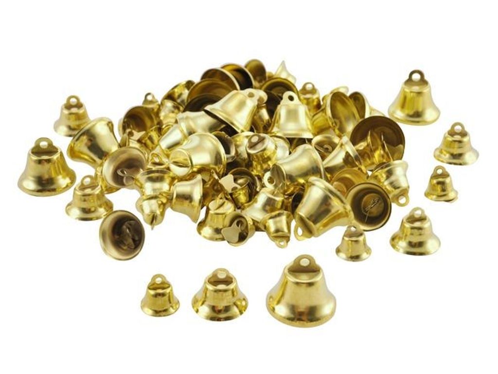 Guldfärgade klockor i tre olika storlekar. Sy på klockorna på figurer, tyg eller varför inte ett kort. Dessa pysselbjällror har en liten ögla upptill, vilket är användbart för upphängning med eller tråd eller snöre. Eftersom dessa bjällror är tillverkade av mässing har de ett elegant utseende och är beständiga mot korrosion. De finns i olika storlekar så att du kan personanpassa dina hantverk. Fördelning: 26 mm = 20 st 21 mm = 30 st 15 mm = 50 st - Antal: 100/FP - Med små öglor - Material: Mässing - Mått: 15 mm, 21 mm och 26 mm