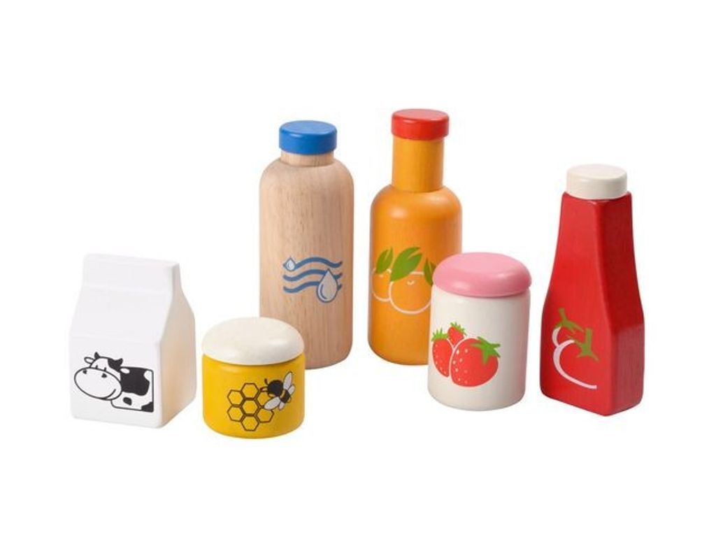 Ett härligt lekset med olika brukar och flaskor inom mat. Mat och dryckset innehåller 6 olika burkar och flaskor, med bl.a mjölk, kechup, sylt och honung. - Tillverkade av återplanterat gummiträd
