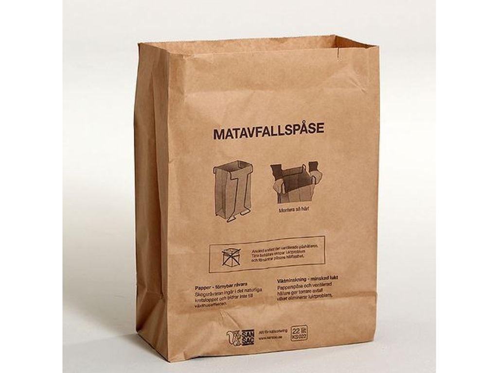 Beskrivning av Matavfallspåse SANSAC Papp 22L 100/BNT Matavfallspåse av vattenavvisande kraftpapper, SOS-botten. - Kapacitet: 22L - Mått: 320 x 160 x 430 mm