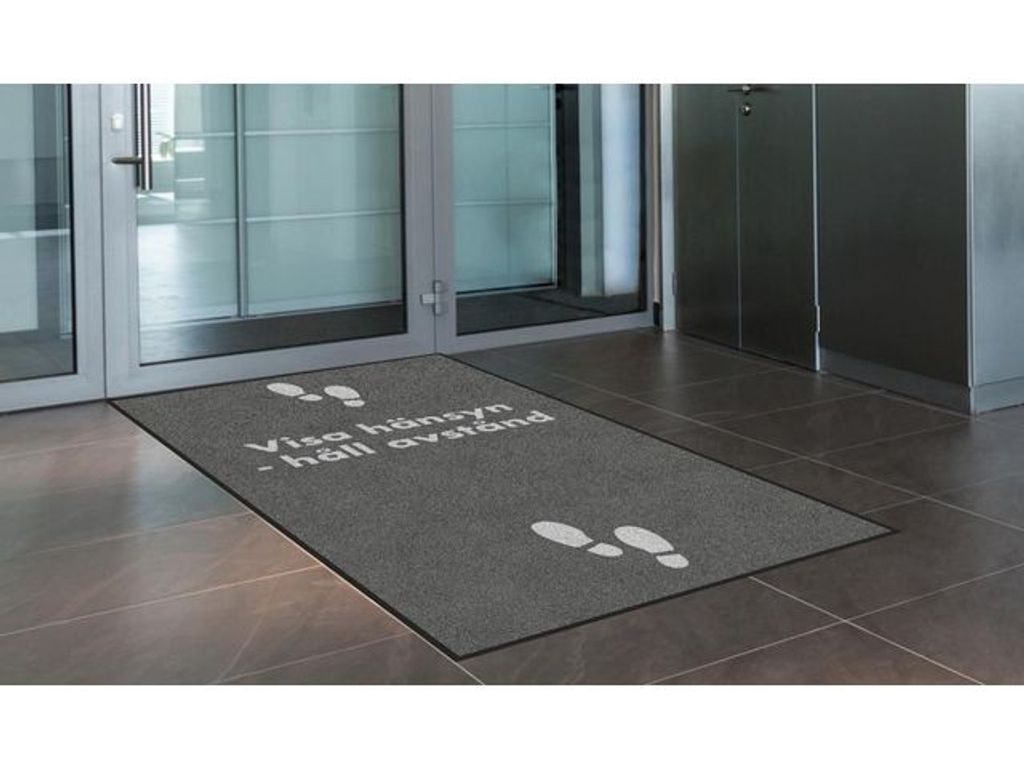 Med en Classic Print i entrén får du inte bara en snygg och välkomnande entré, utan också en effektiv hållbar torkmatta som suger upp väta och samlar upp damm, sand och smuts. En Classic Print passar utmärkt för tryck av logotyper, illustrationer och foto. Det kraftiga smutsavisande PET-garnet (av 100% återvunnet material) ger en mycket fin lyster och färgbeständighet. Mattans baksida är gjord av tjock och kraftig nitrilgummi med förstärkta kanter. - Håll avstånd - 85x150cm - Grå - 100% återvunnet material - PVC fri